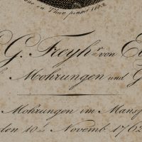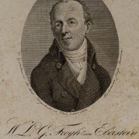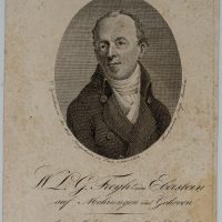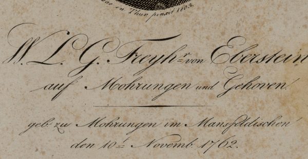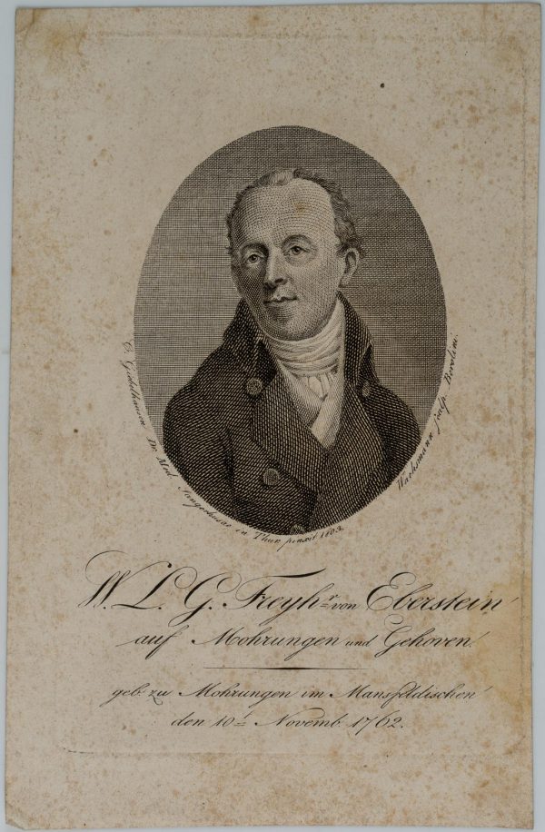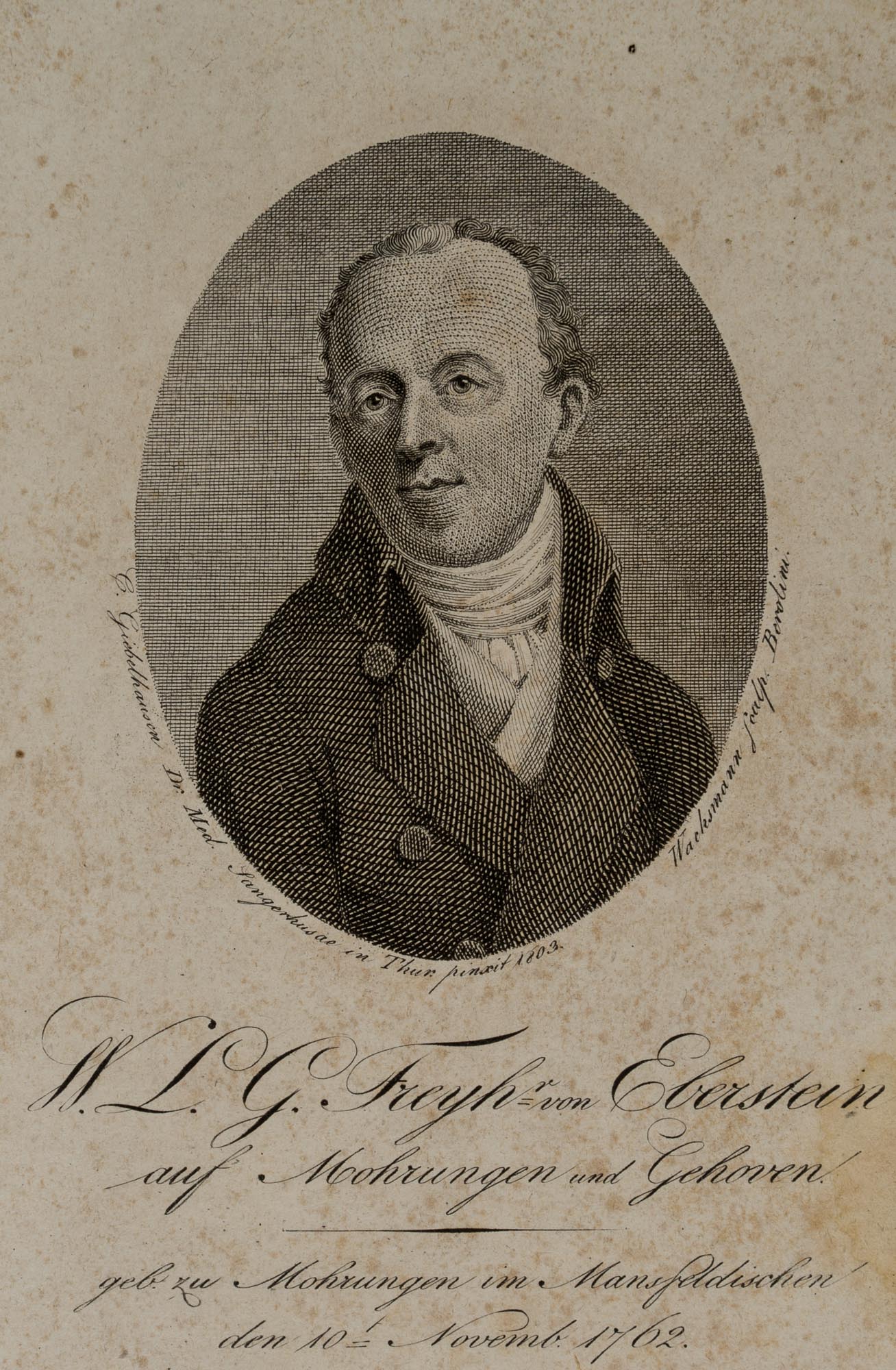 - Bezeichnung: Unterhalb der Darstellung signiert und datiert “C. Giebelhausen Dr. Med. Sangerhusae in Thur pinxit 1803 / Wachsmann sculp. Berolini”. Darunter betitelt und mit den Lebensdaten des Dargestellten. Bildnis des deutschen Schriftstellers und Philosophen Wilhelm Ludwig Gottlob von Eberstein (* 1762 in Morungen – 1805 ebenda). Das Blatt stammt aus dem berühmten Hause “Ludwig Rosenthal’s Antiquariat”, München.
