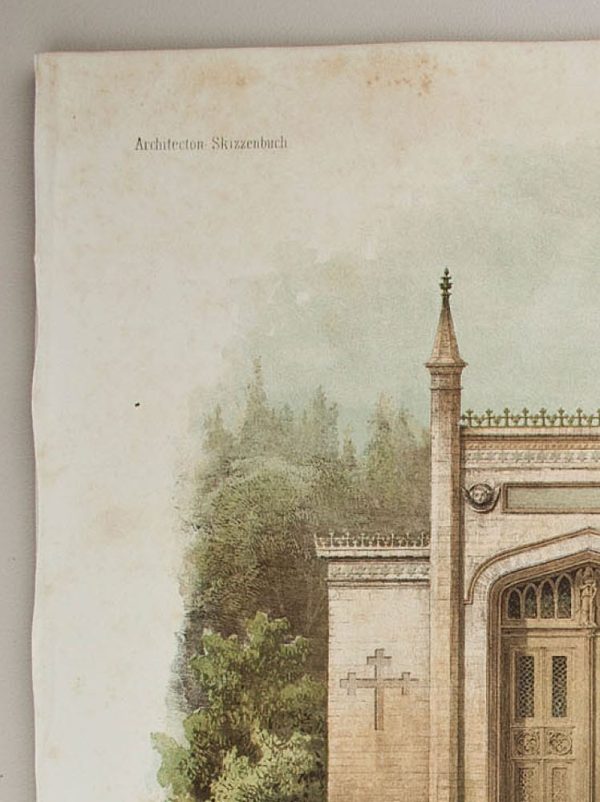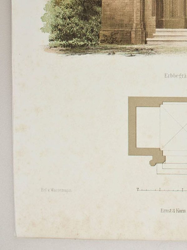 - Beschreibung: Erbbegräbniss. Mit Grundriss. Farbige Lithographie (1860-1866). Lithographie Anst. v. W. Loeillot in Berlin. Erf., Heft X. Blatt 1. Größe des Blattes: 34,5 x 25,3 cm. Aus dem Architectonisches Skizzenbuch Verlag Ernst & Korn in Berlin. Es handelt sich hierbei um `’La Tête de collection’ die Französischen Ausgabe dieser zeitgenössischen Deutschen Architektur. Die Textseiten wurden übersetzt und gedruckt in Paris. Die erste Französische Ausgabe (Juli 1860) korrespondiert mit der Ausgabe 41 der Deutschen Ausgabe.