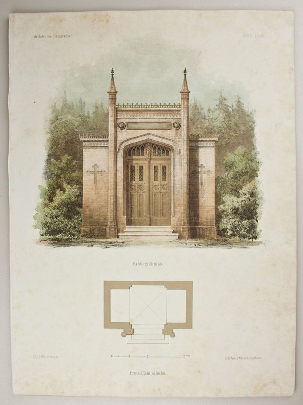 - Description: Hereditary burial. With ground plan. Coloured lithograph (1860-1866). Lithograph inst. by. W. Loeillot in Berlin. Compilation, booklet X. Sheet 1. size of the sheet: 34.5 x 25.3 cm. From the Architectonisches Skizzenbuch published by Ernst & Korn in Berlin. This is ‘La Tte de collection’ the French edition of this contemporary German architecture. The text pages were translated and printed in Paris. The first French edition (July 1860) corresponds with edition 41 of the German edition.