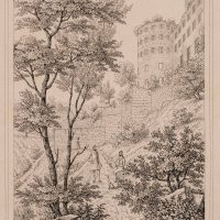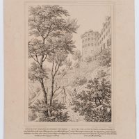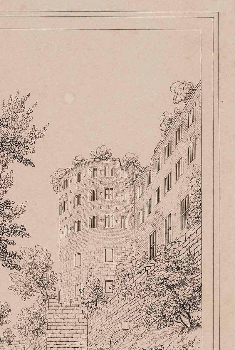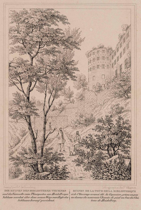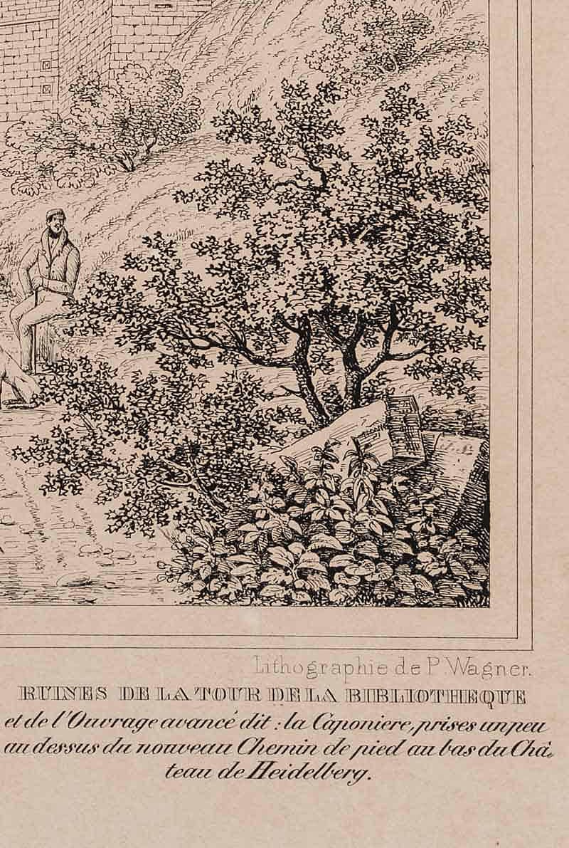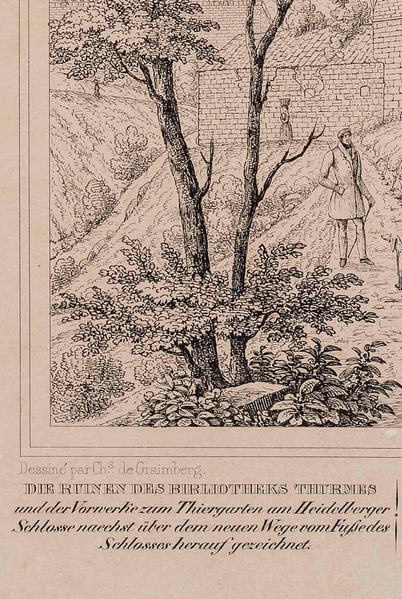 Peter Wagner (*um 1795 Karlsruhe) nach Carl von Graimberg (1774 Schloß Paar – 1865 Heidelberg), Spazierende am Bibliotheksturm an der Ruine von Schloss Heidelberg, Biedermeier, 19. Jahrhundert, Lithographie