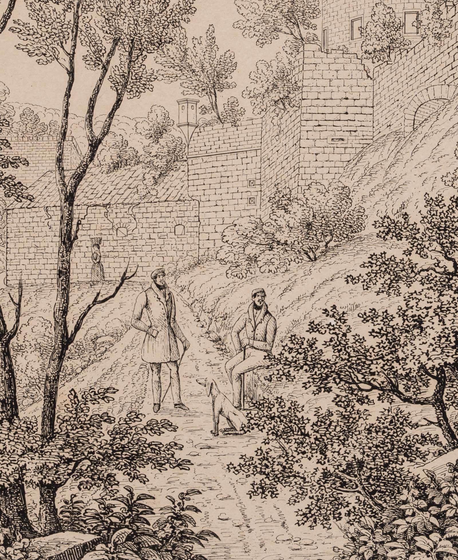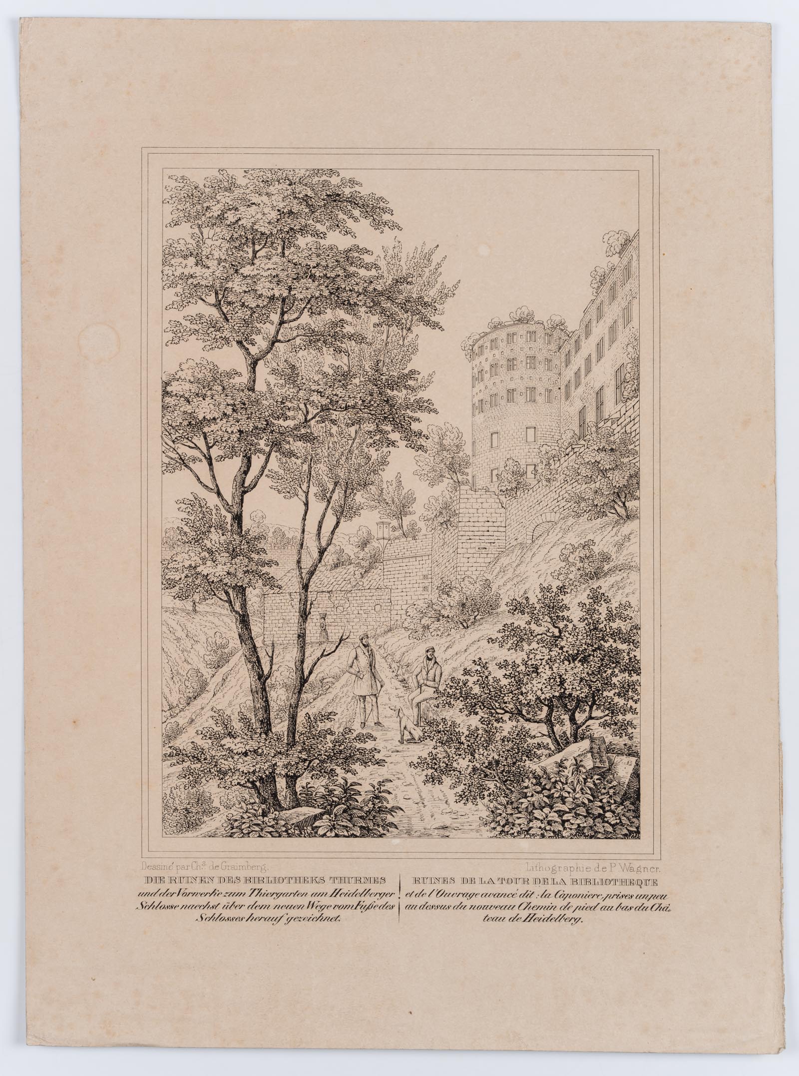Peter Wagner (born around 1795 Karlsruhe) after Carl von Graimberg (1774 Pair lock – 1865 Heidelberg), Strolling by the library tower at the ruins of Heidelberg Castle, Biedermeier period, 19th century, Lithography