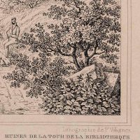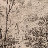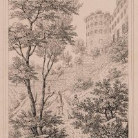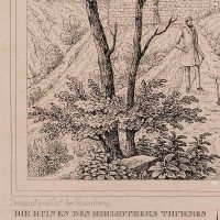 - Bezeichnung: Unterhalb im Stein signiert und zweisprachig bezeichnet: “Die Ruinen des Bibliotheks Thurmes und der Vorwerke[…]”. Unten rechts im Stein monogrammiert: “J.S.”.