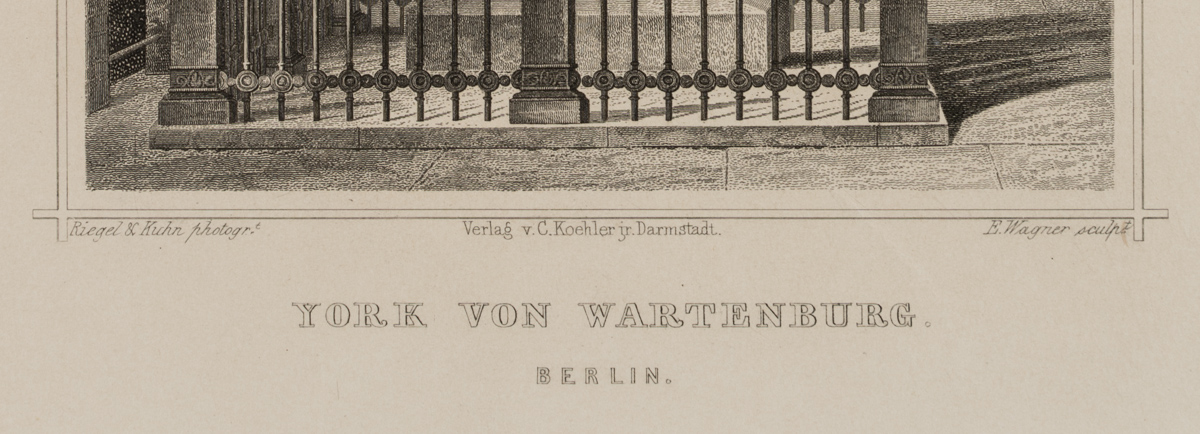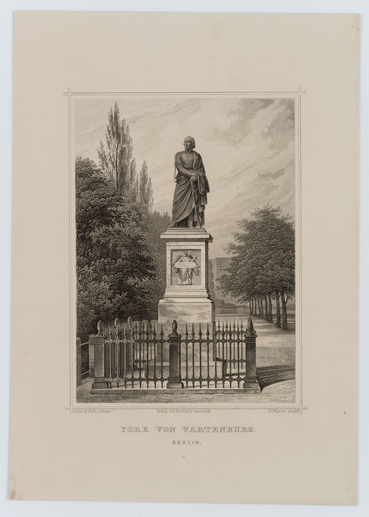 - Description: After a photograph by “Riegel & Kuhn”. From a series of monuments to famous commanders created by the sculptor Christian Daniel Rauch and erected on Unter den Linden in Berlin. Showing the monument to the Prussian Fideikommissar Hans David Ludwig Graf Yorck von Wartenburg.