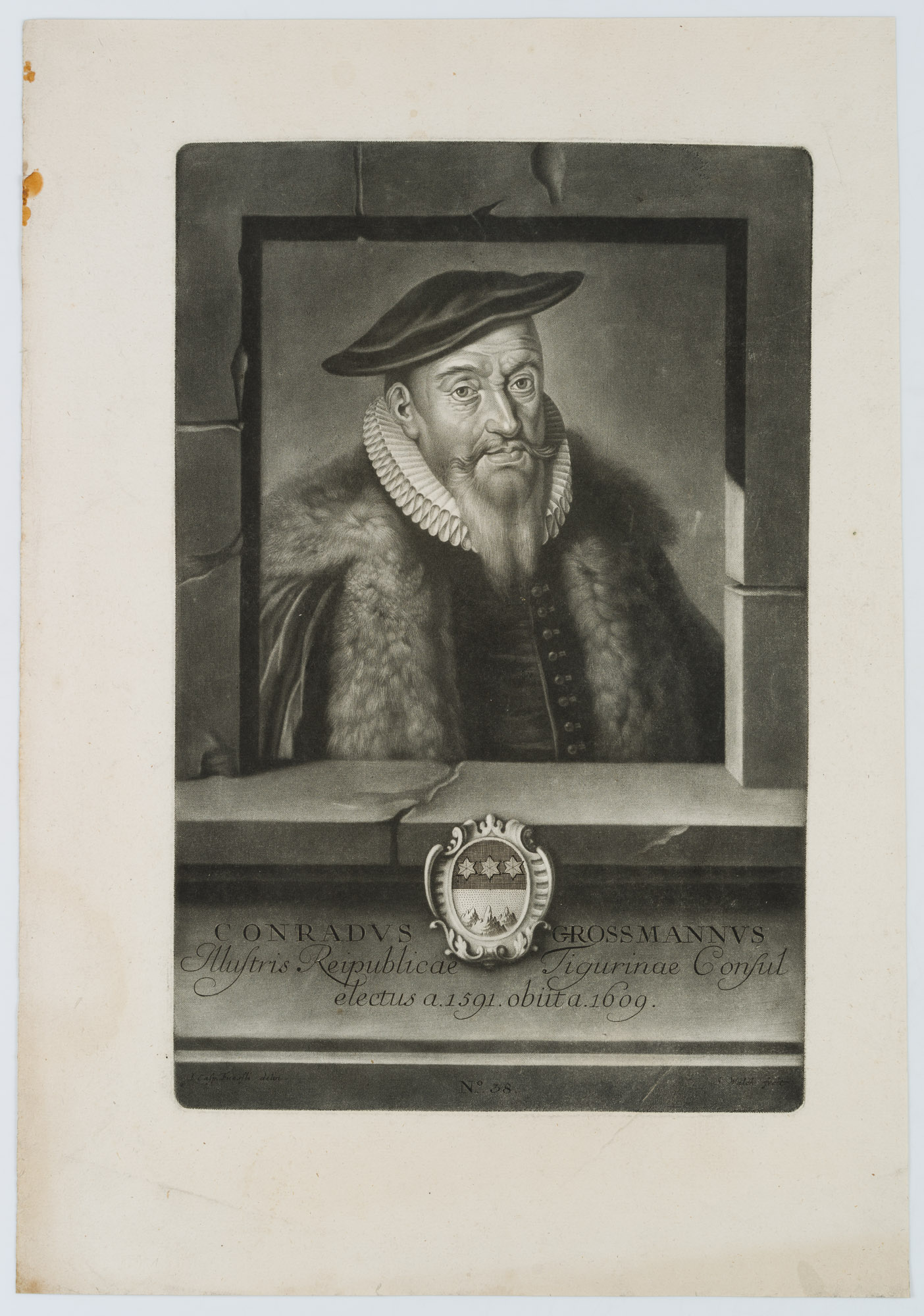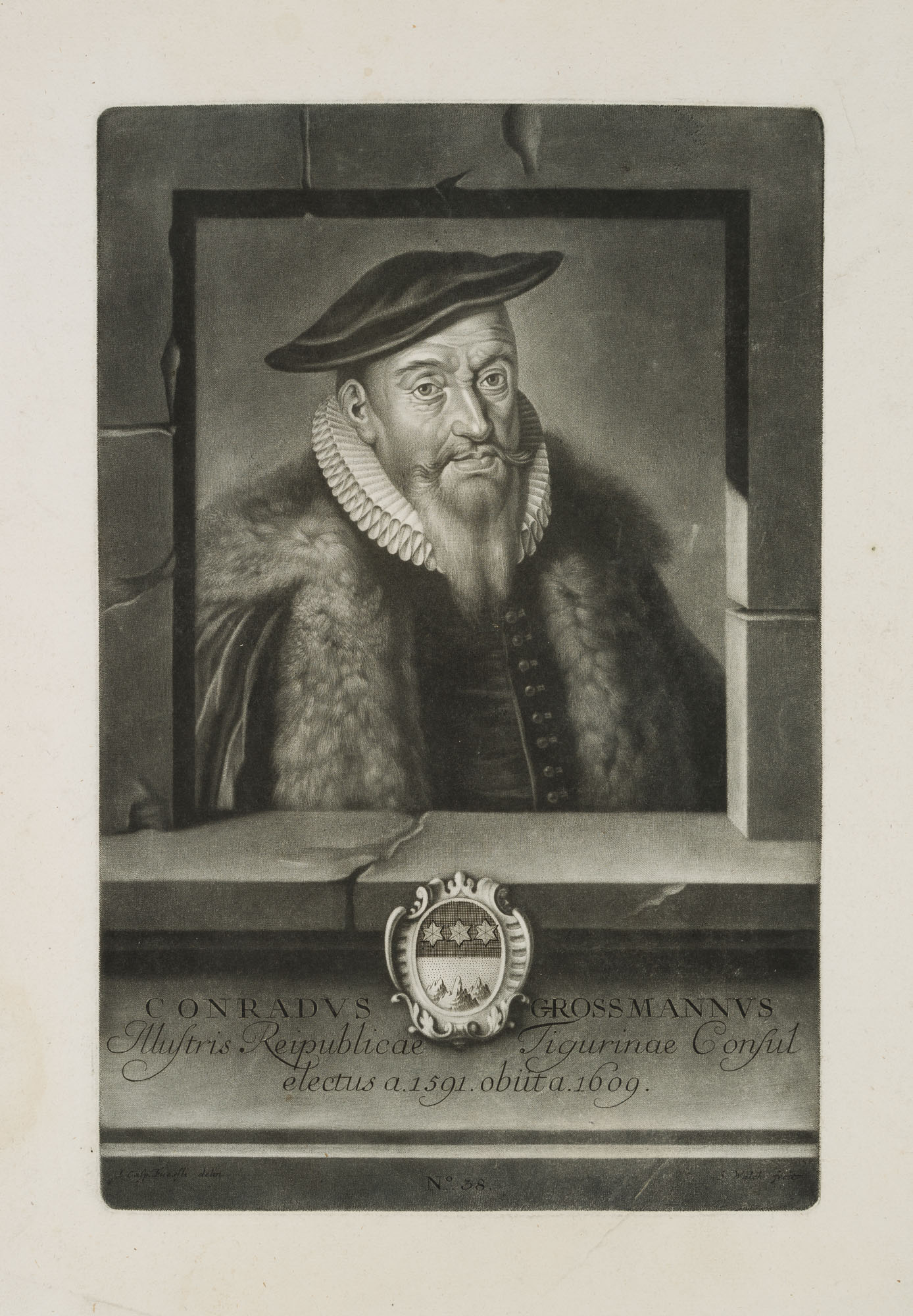 • Inscription: Titled and signed at the bottom of the image “Conradus Grossmannus / Illustris Reipublicae ..electus a 1591 obiit 1609. / J. Casp. Fuessli delin. / No. 38 / S. Walch fecit”. From: Sebastian Walch: Portraits of all Burger-Meistern, Der Vortreffliche Republique, Stadt und Vor-Orths Zürich Von dem 1336ten biß auf das 1742te Jahr. Kempten 1756. copper engravings by Sebastian Walch after a model by Johann Caspar Füssli.