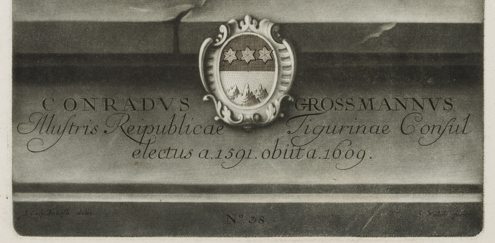 • Bezeichnung: Unten in der Darstellung betitelt und signiert “Conradus Grossmannus / Illustris Reipublicae ..electus a 1591 obiit 1609. / J. Casp. Fuessli delin. / No. 38 / S. Walch fecit”. Aus: Sebastian Walch: Portraits aller Herren Burger-Meistern, Der Vortrefflichen Republique, Stadt und Vor-Orths Zürich Von dem 1336ten biß auf das 1742te Jahr. Kempten 1756. Kupferstiche von Sebastian Walch nach Vorlage von Johann Caspar Füssli.