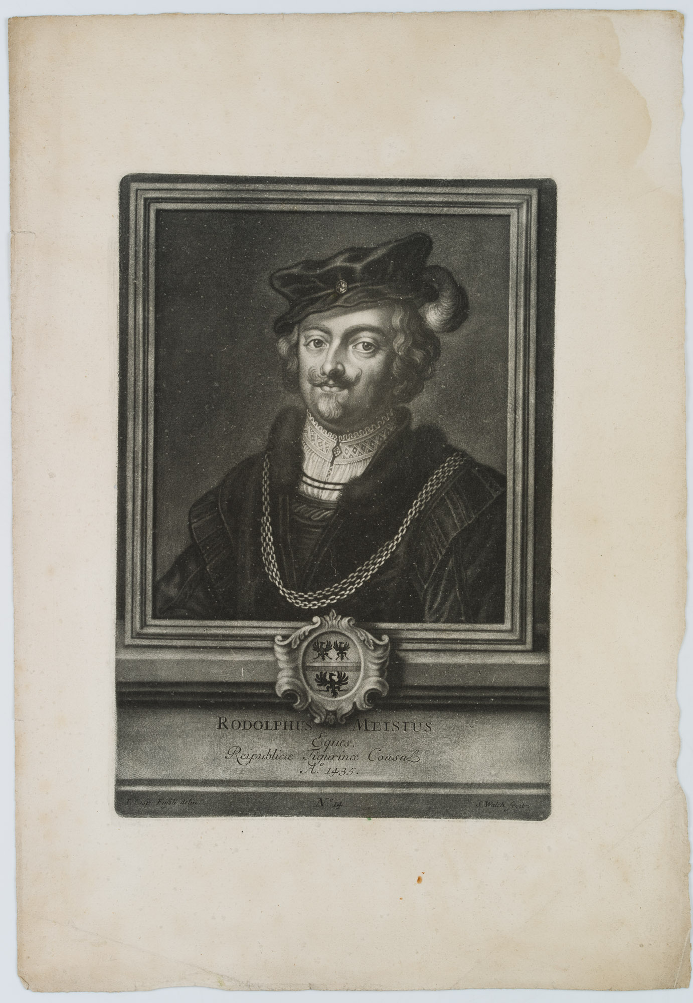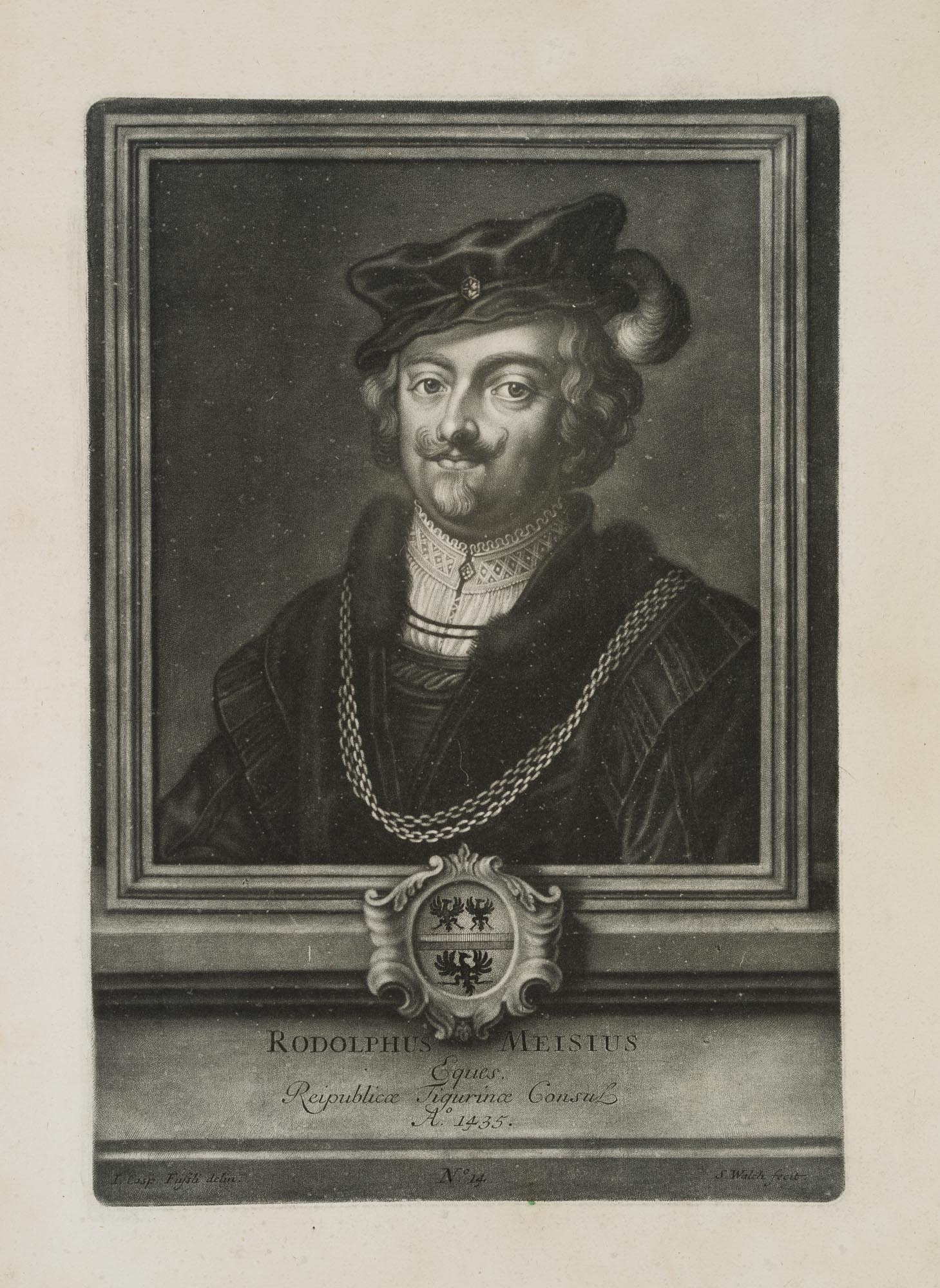 - Bezeichnung: Unterhalb des Bildnisses: “Rodolphus Meisius / Eques, / Reipublice Tigurinae Consul / Ao. 1435.” ” J. Casp. Fuessli delin. / No. 38 / S. Walch fecit”.