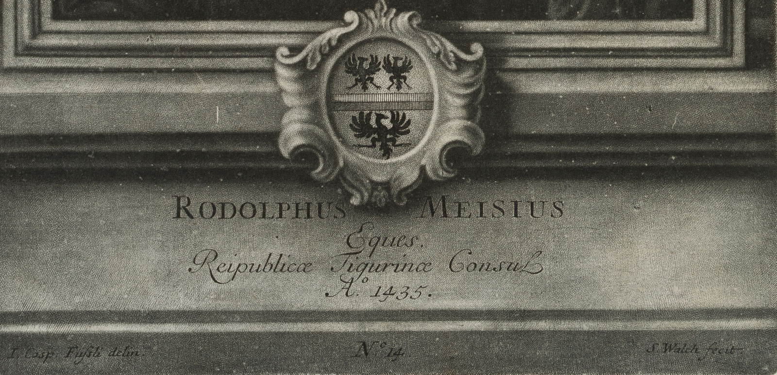 - Inscription: Below the portrait: “Rodolphus Meisius / Eques, / Reipublice Tigurinae Consul / Ao. 1435.” ” J. Casp. Fuessli delin. / No. 38 / S. Walch fecit”.