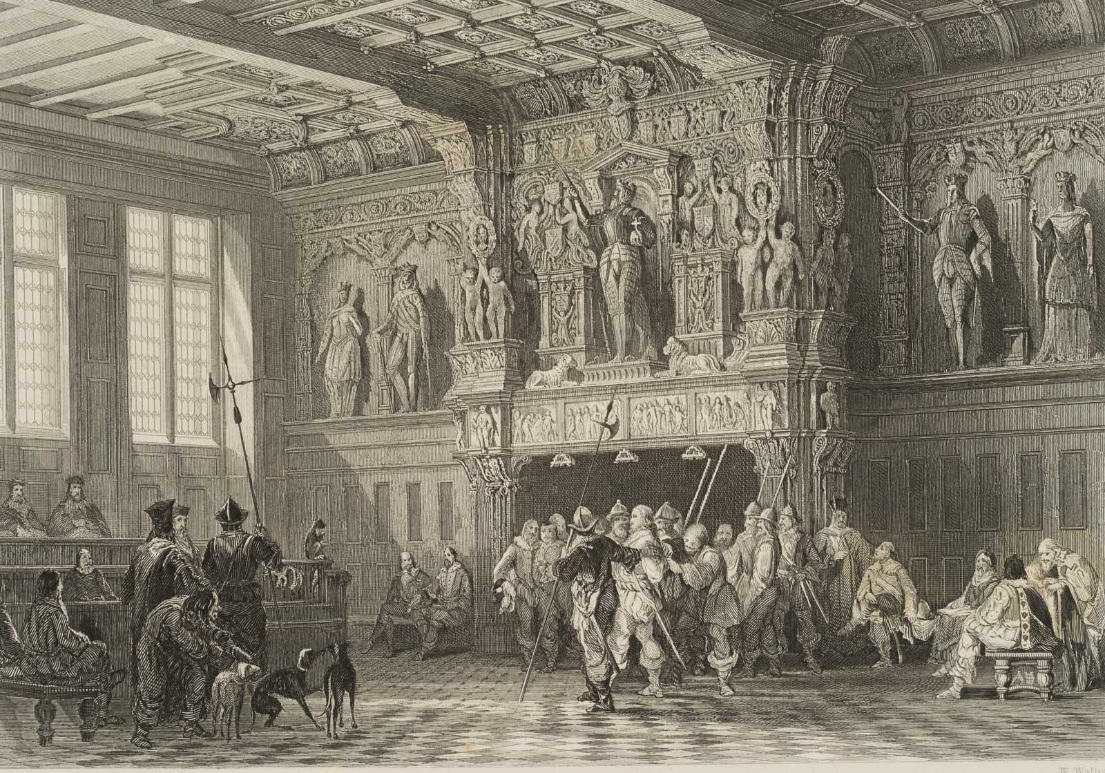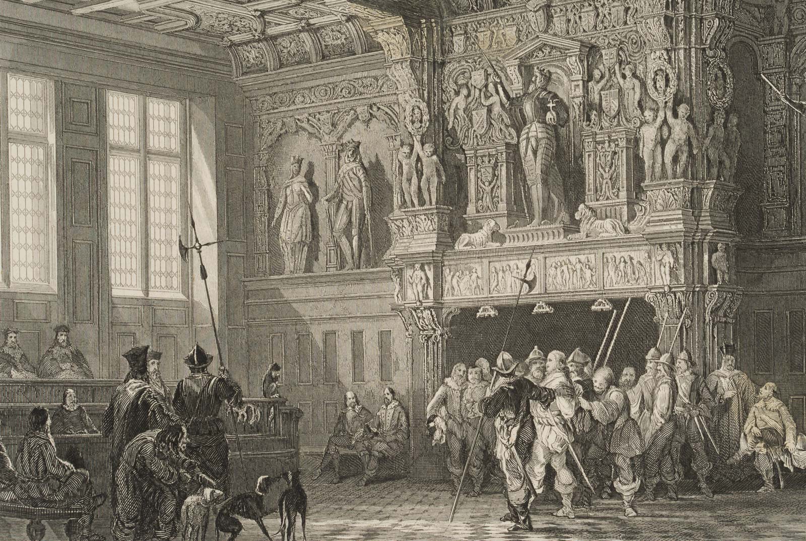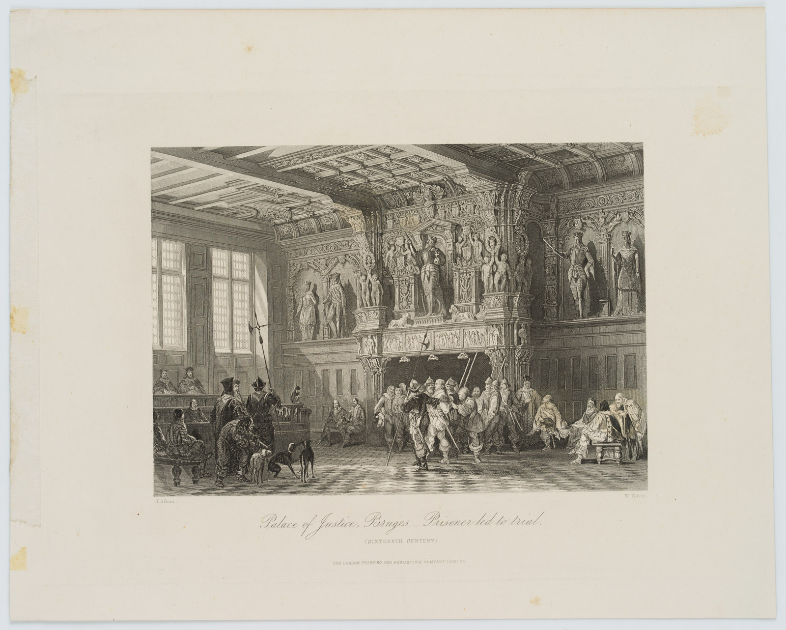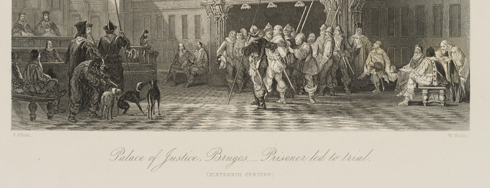 William Wallis (born 1796 London) after Thomas Allom (1804 London – 1872 Barnes/Surrey), Palace of Justice, Bruges Prisoner, led to trial (sixteenth century), 19th century, Steel engraving