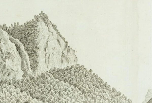 - Zustand: Guter Zustand. Bild trägt eine vertikale Knickfalte auf der rechten Blattseite, da es vermutlich als Faltbeilage in einem Buch gedient hat. Papierverlust in der Mitte des Bildes. Diese fragil gewordenen Stellen werden von einem vertikalen Klebestreifen auf der Rückseite befestigt. Druck macht einen frischen Eindruck.