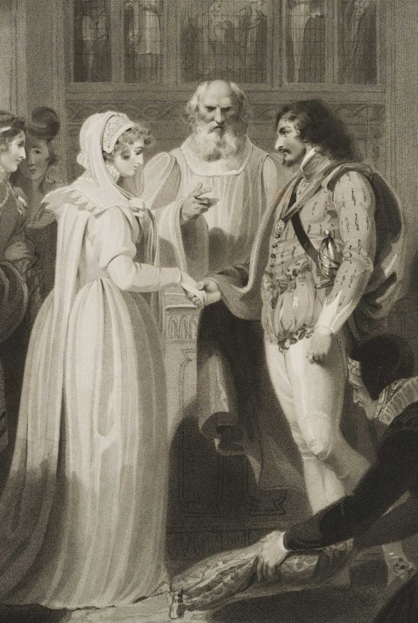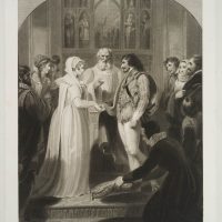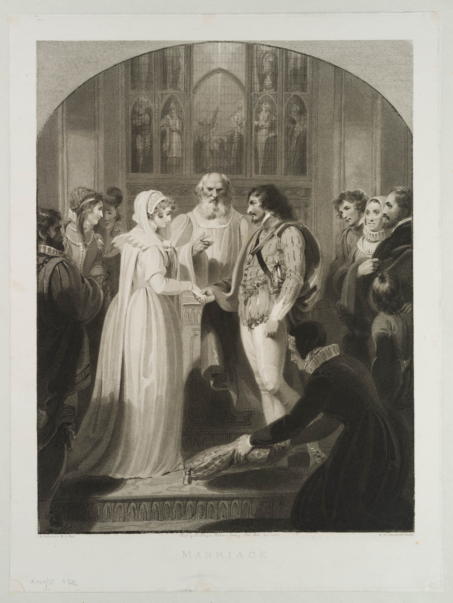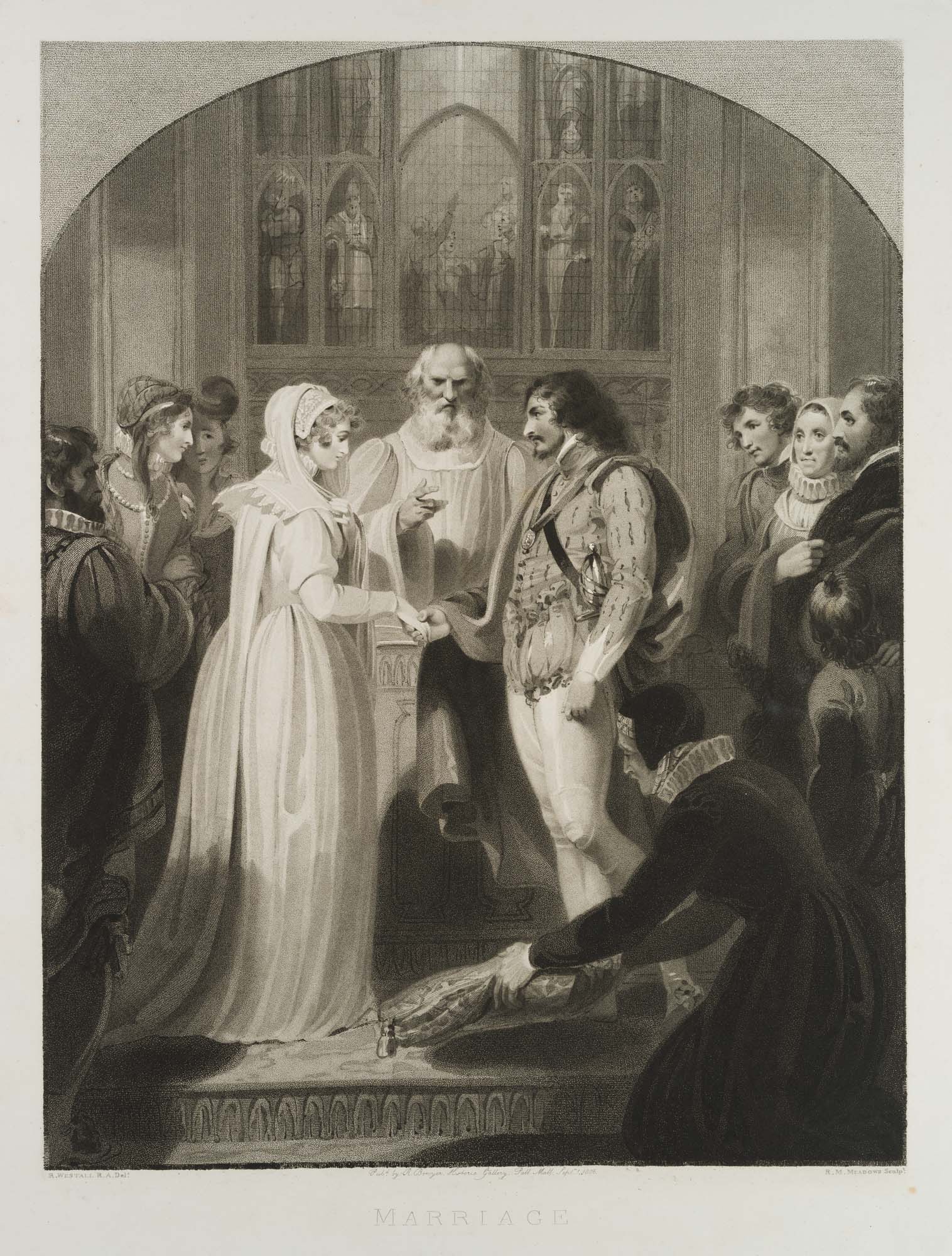 - Description: Sheet of excellent print quality. Signed, dated and inscribed below the image: “R. Westall R.A. Del. / Pub.d by R. Bowyer. Historic Gallery. Pall Mall Sept. 1806 / R. M. Meadows sculp.t”. Titled typographically in centre below: “Marriage. Wedding ceremony taking place at the altar, early 19th century. After R. Westall, from: ‘Westall’s Illustrations of the Book of Common Prayer.’
