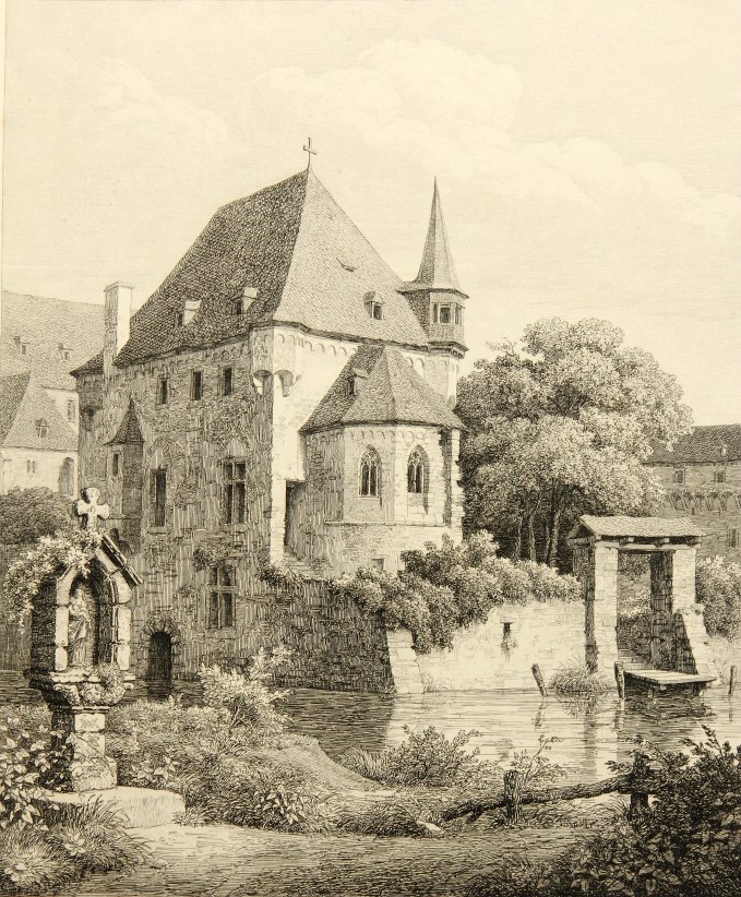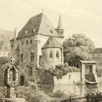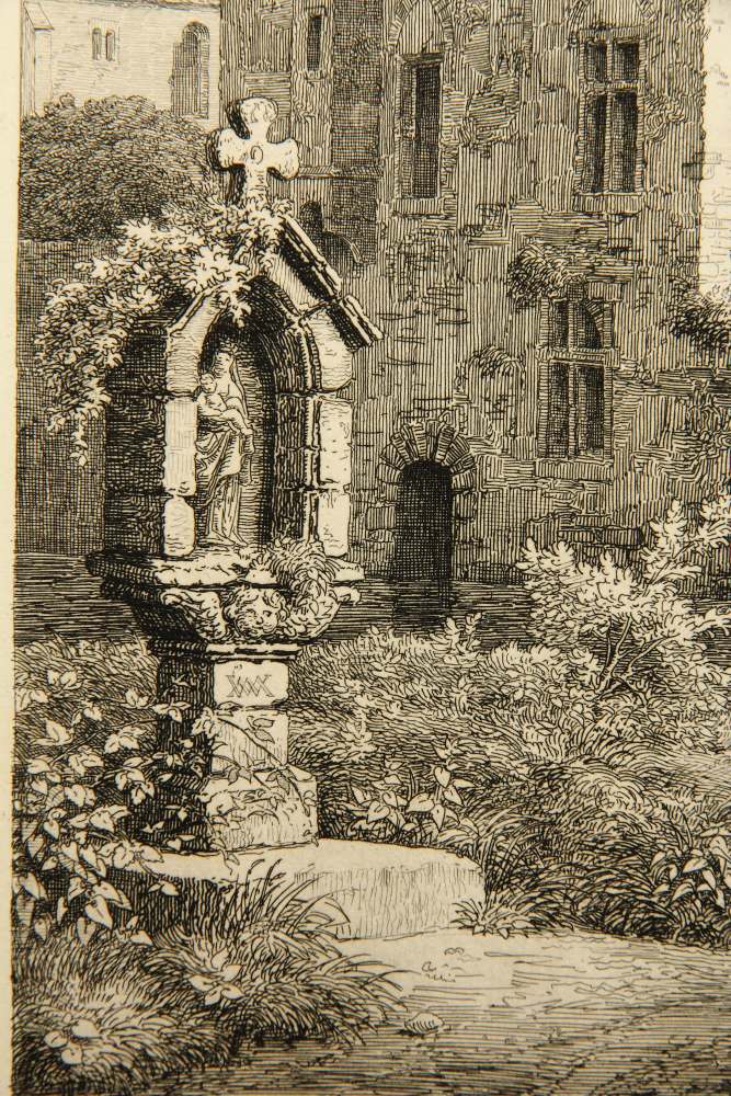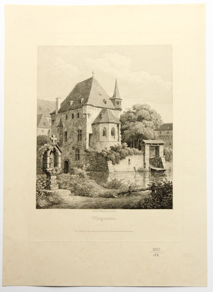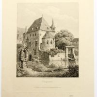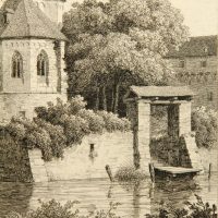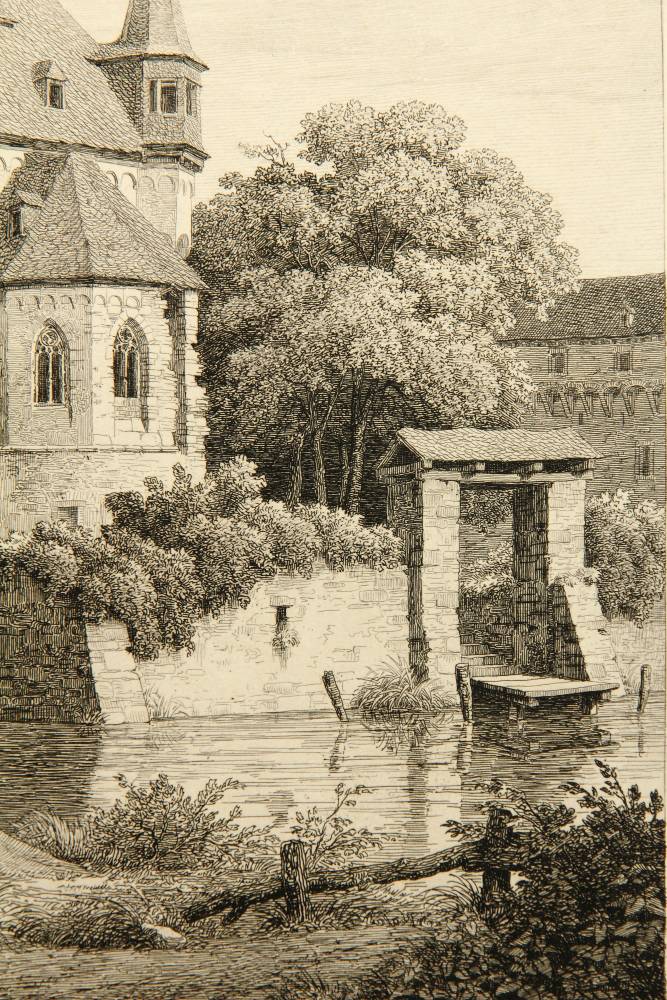 Rudolf Wiegmann (1804 Adensen – 1865 Düsseldorf) nach Julius Buddeus (1812 Bielefeld – 1873 Düsseldorf), Marienschrein und mittelalterliche Kapelle am Fluß, 19. Jahrhundert, Radierung