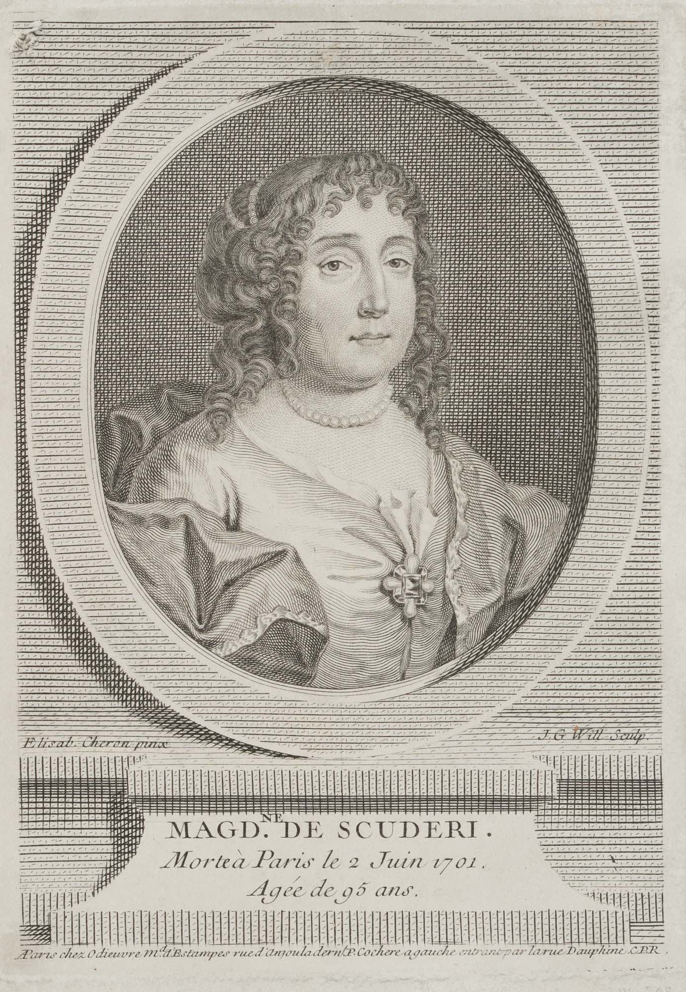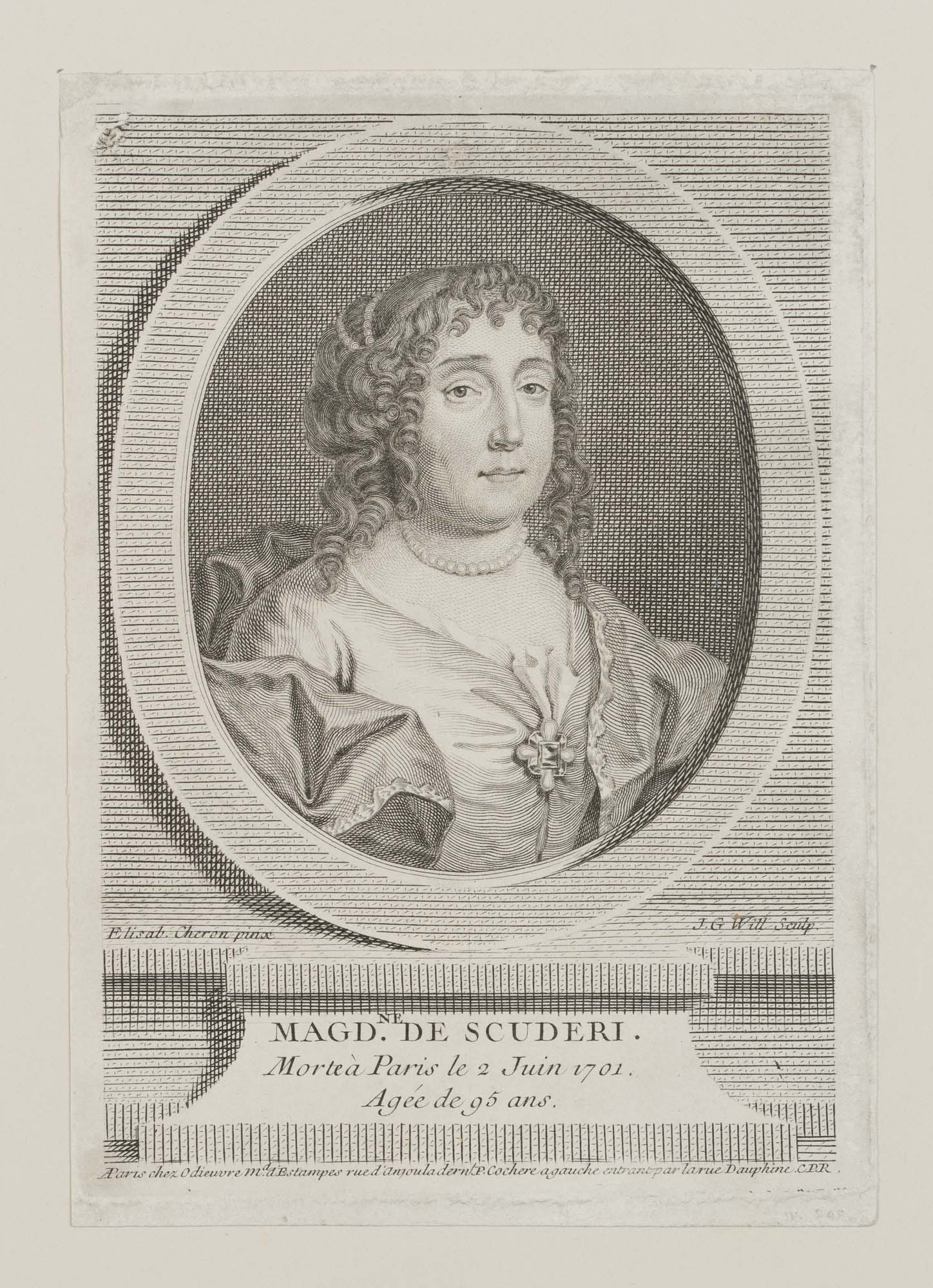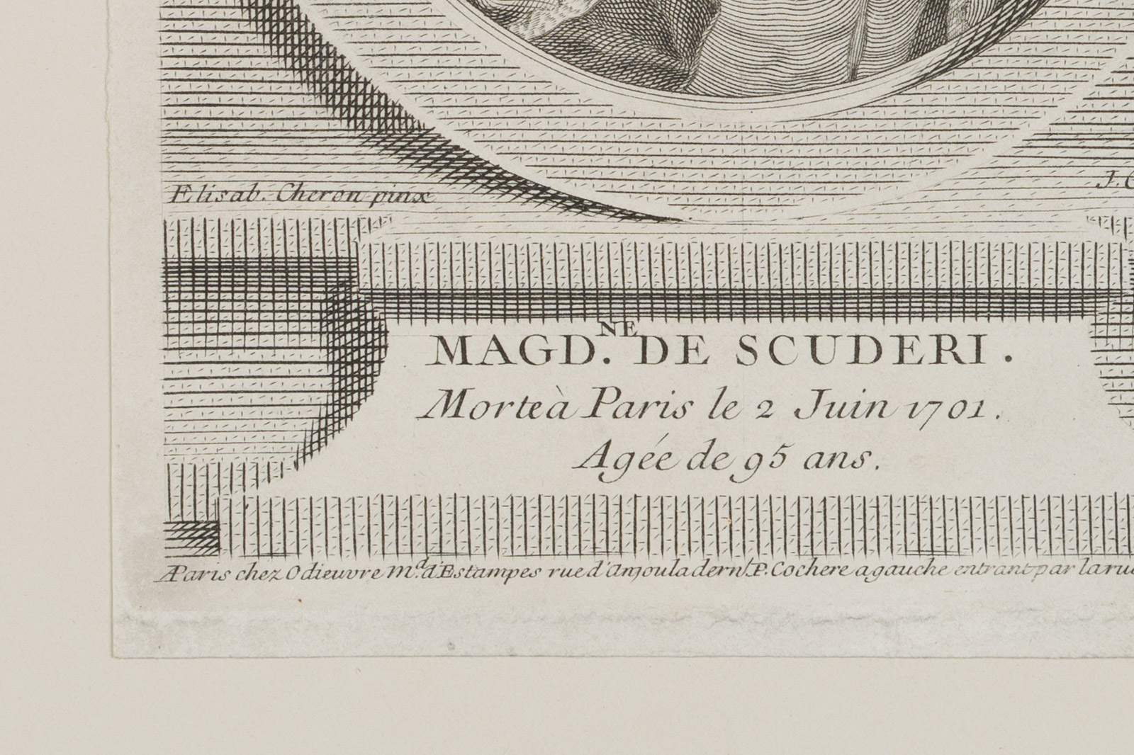 • Bezeichnung: Unterhalb des Dargestellten in der Druckplatte signiert, darunter mit dem Namen der Dargestellten beschriftet “Magd. Ne De Scuderi. Morte à Paris le 2 Juin 1701. Agée de 95 ans.”, darunter die Angabe des Verlags: “A Paris chez Odieuvre M.a d Estampes rue d’Anjoula dern. P. Cochere a gauche entrant par la rue Dauphine CPR”.