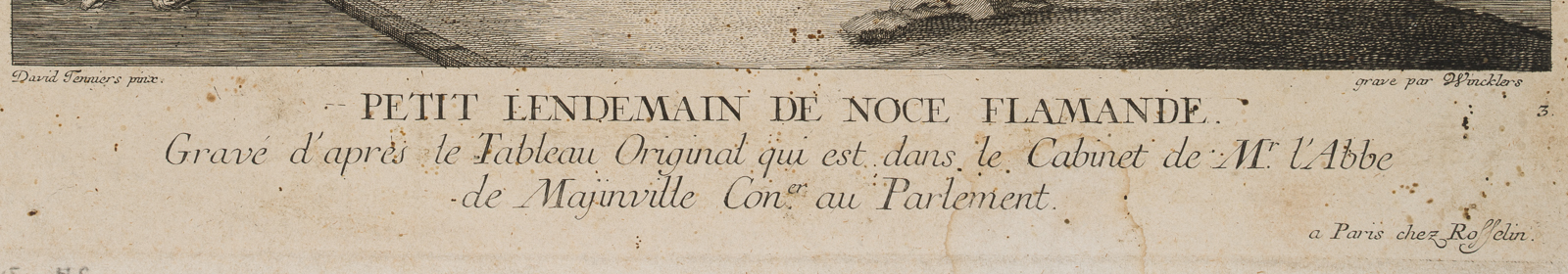 - Beschreibung: Unter der Darstellung signiert “David Tenniers pinx. / grave par Wincklers”, darunter bezeichnet “Gravé d’après le Tableau Original qui est dans le Cabinet de Mr. l’Abbé / de Majinville Con.er au Parlement. / a Paris chez Rosselin”.