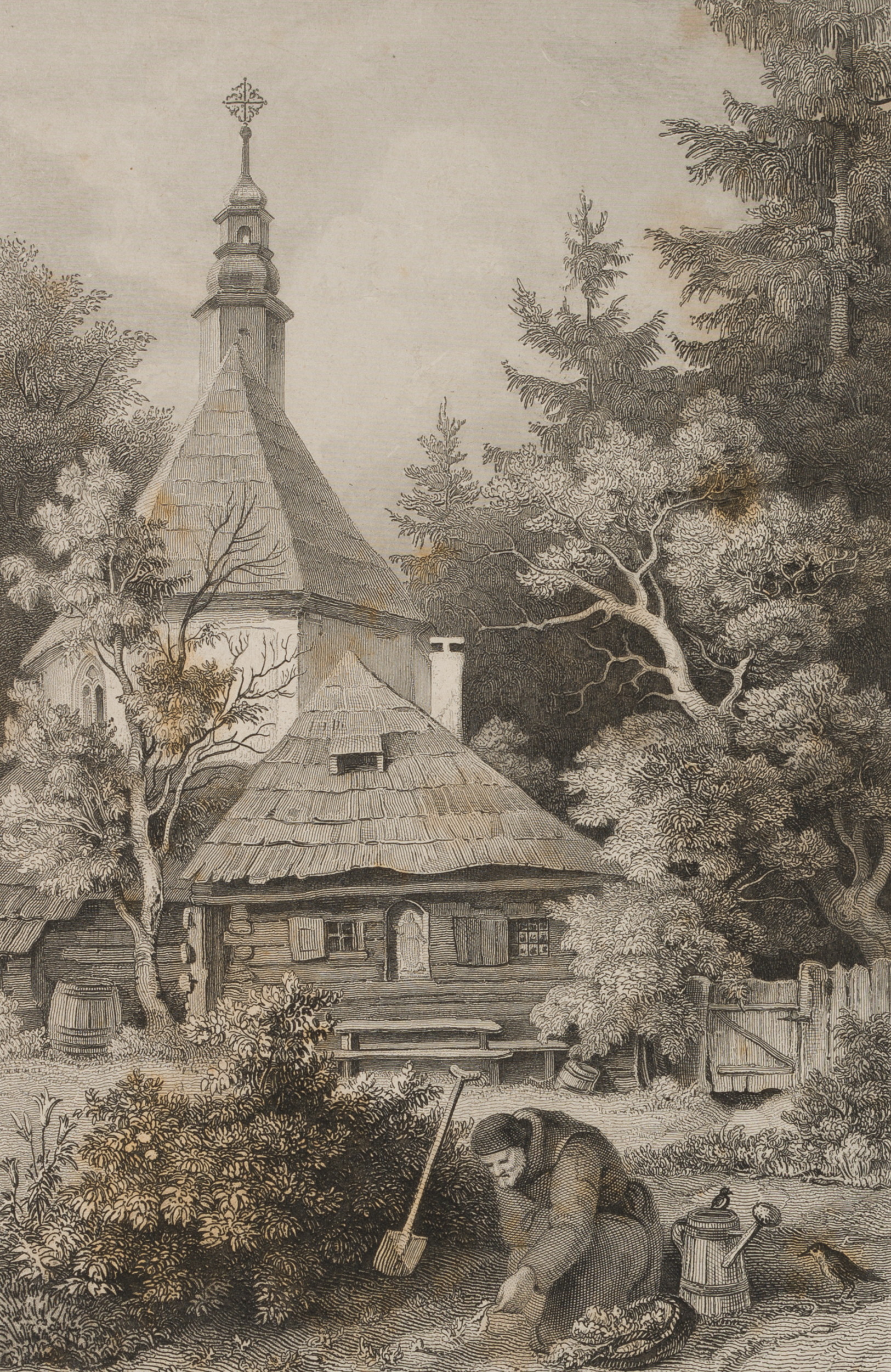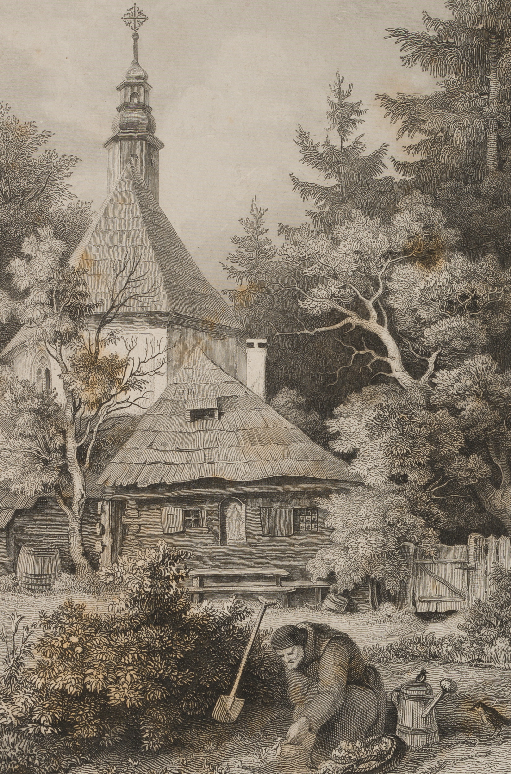 Wilhelm Witthöft (1816 Stralsund – 1874 Berlin) after Ludwig Richter (1803 Dresden – 1884 ibid.), Hermitage near Reinerz Elderly man gardening, c. 1840, Steel engraving