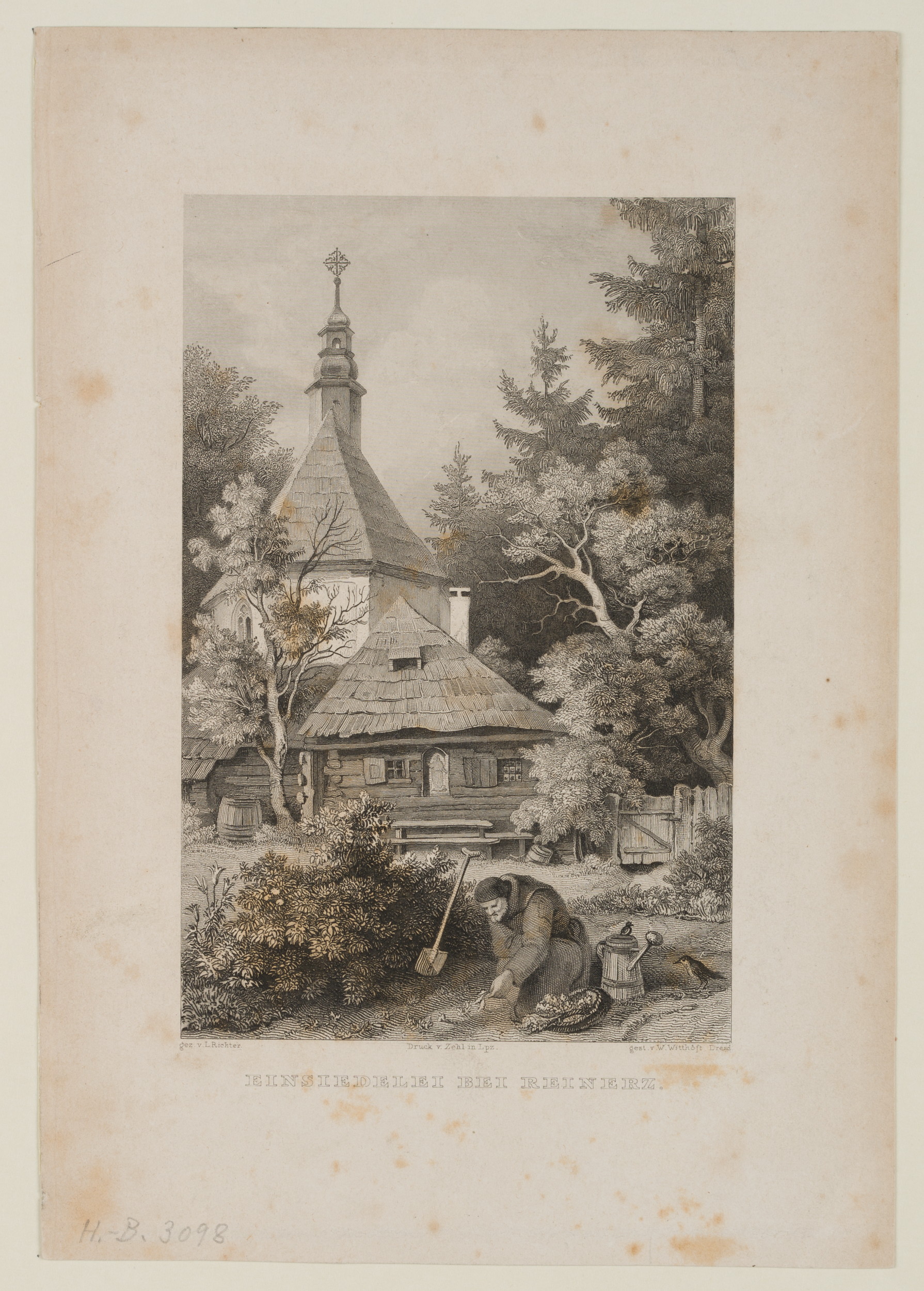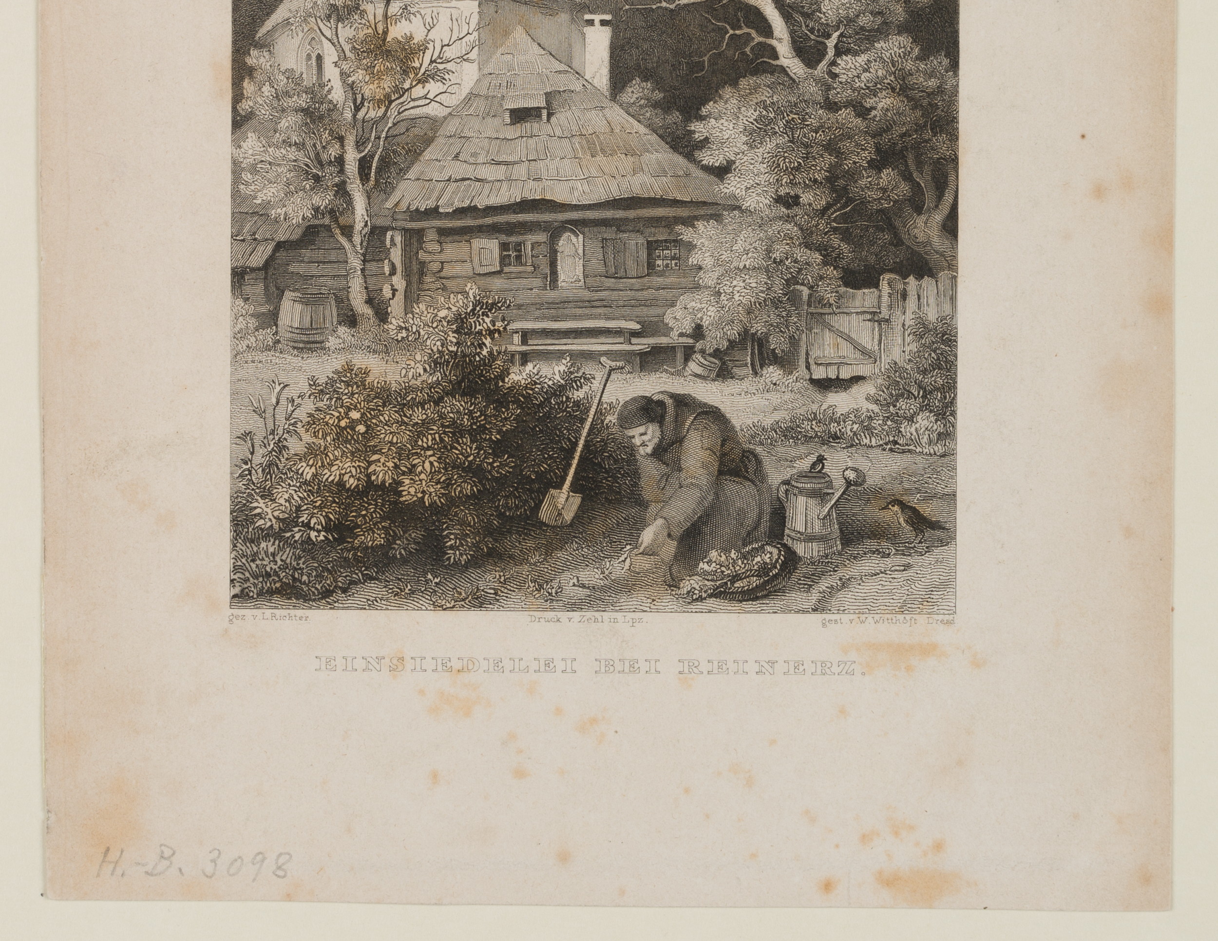 Wilhelm Witthöft (1816 Stralsund – 1874 Berlin) nach Ludwig Richter (1803 Dresden – 1884 ebd.), Einsiedelei bei Reinerz mit älterem Mann bei der Gartenarbeit, um 1840, Stahlstich