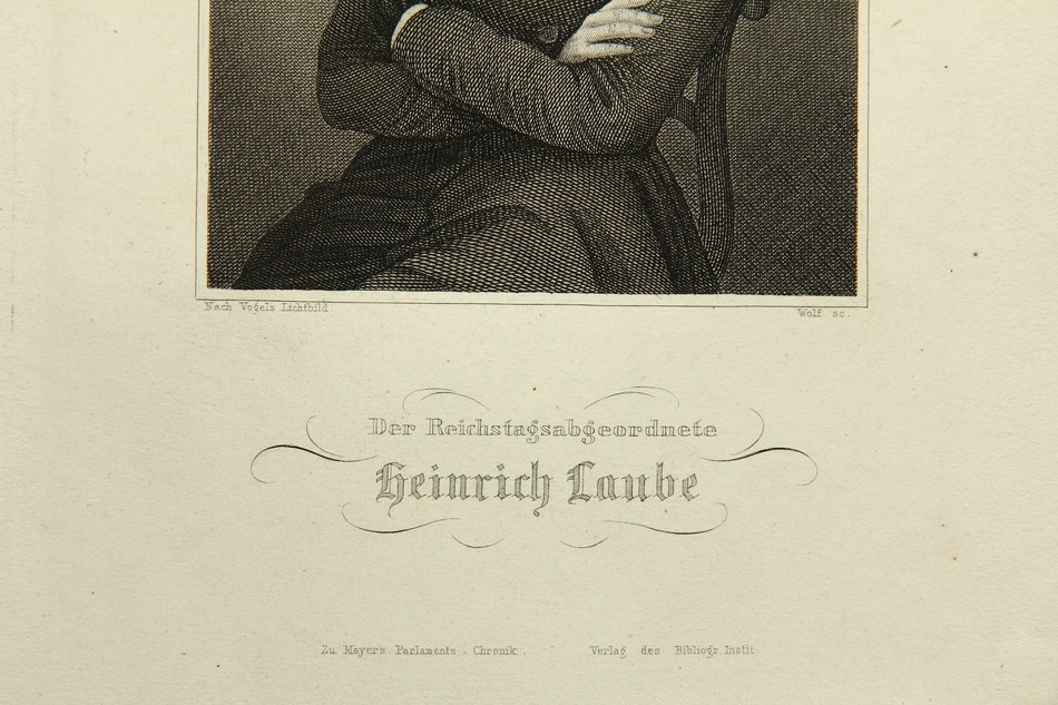 - Inscription: Signed by the artist in the printing plate below the depiction. Below artistically inscribed with the name of the sitter as well as with “Zu Meyer’s Parlaments-Chronik | Verlag des Bibliogr. Instit.”.