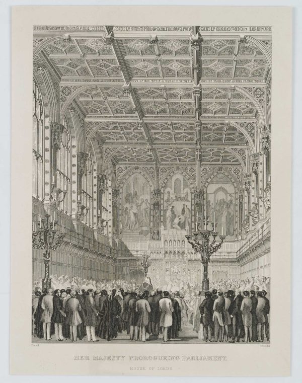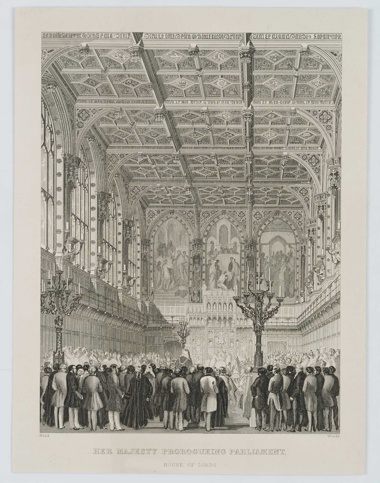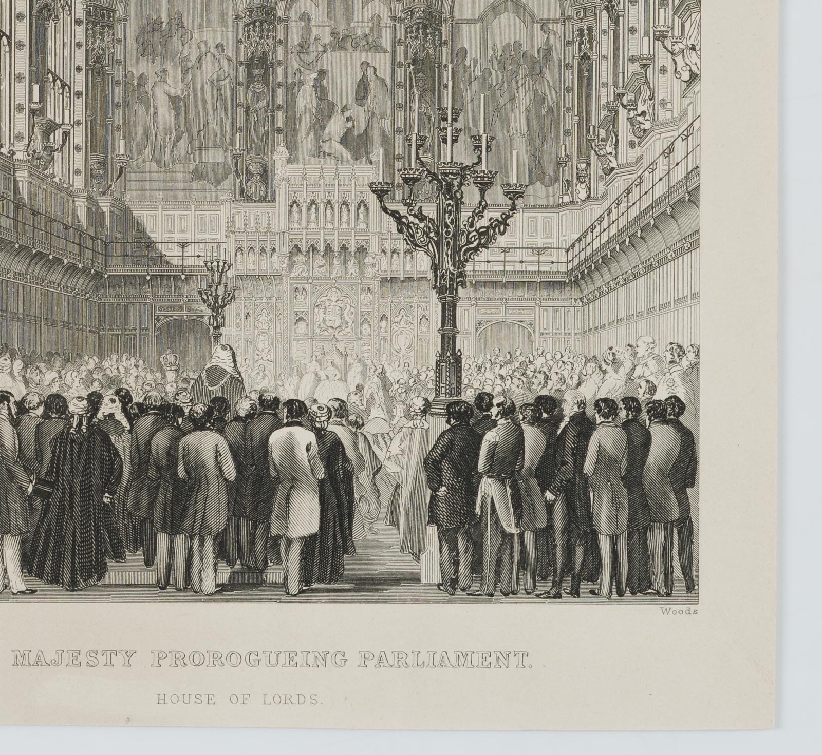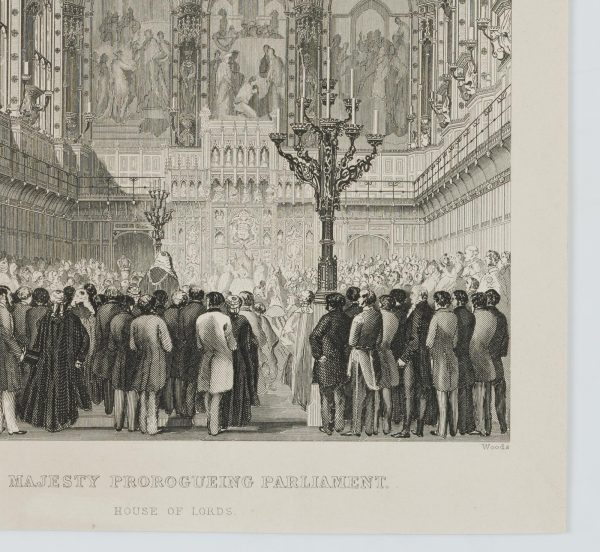 - Inscription: At the lower part signed in the printing plate: “Read / Woods”. At the lower part inscribed in the printing plate: “Her Majesty Proroguing Parliament / House of Lords”.