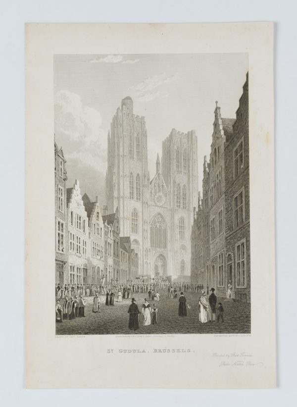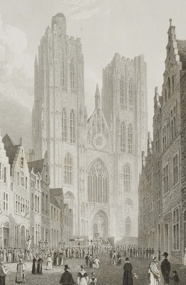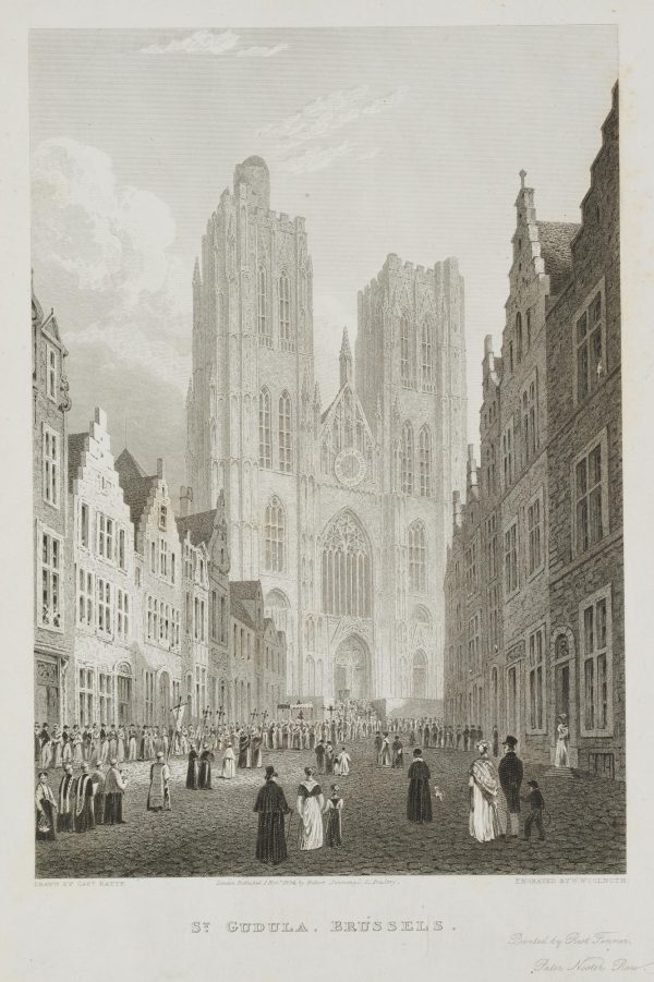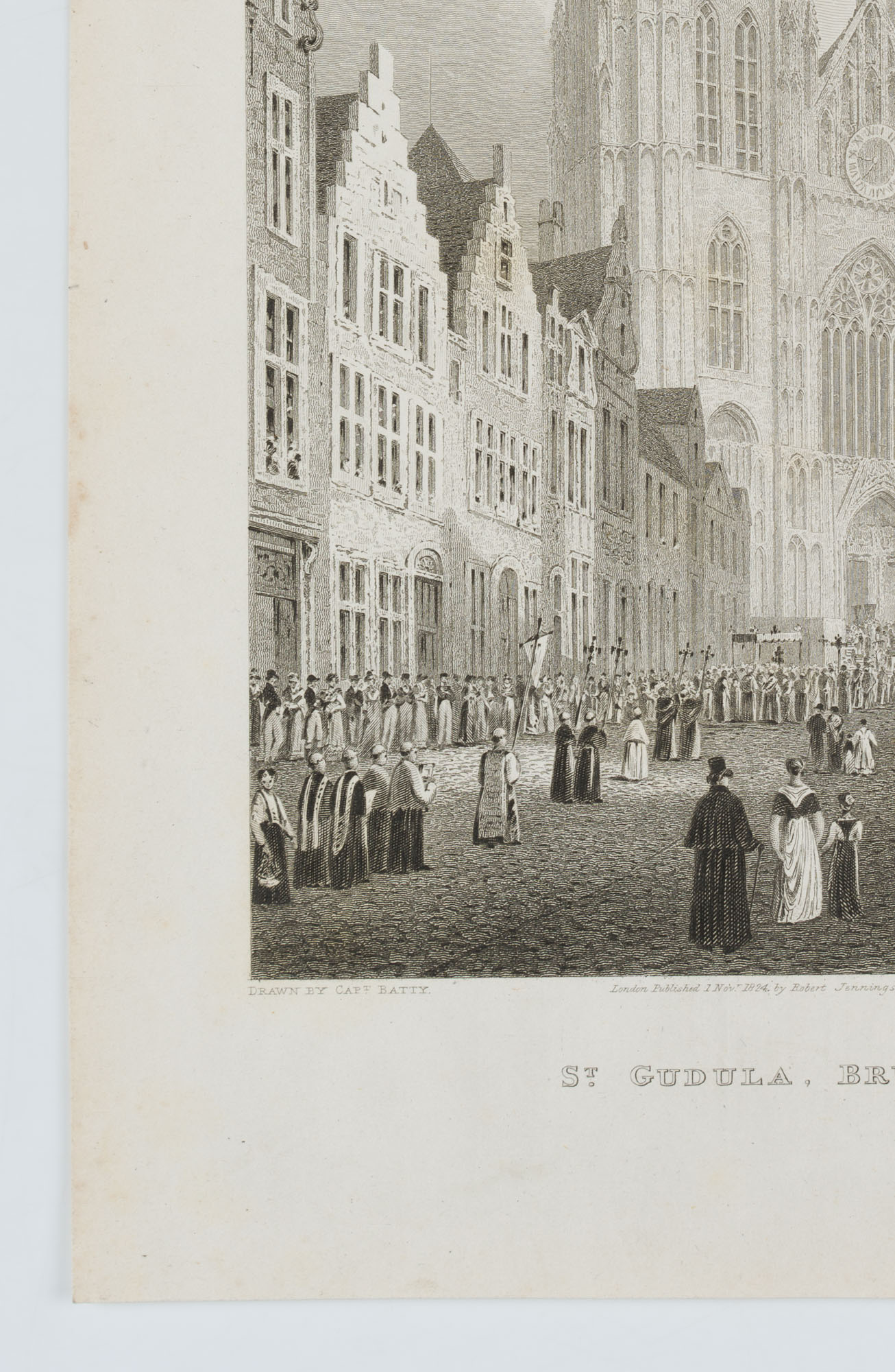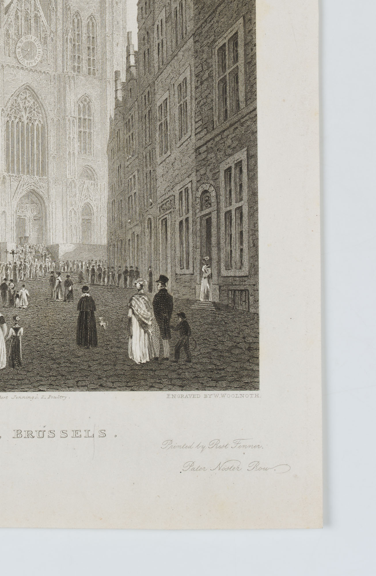 William Woolnoth (born around 1770 ) after Robert Batty (1789 London – 1848 ibid.), View of the Cathedral of St Michael and St Gudula in Brussels with procession, 1824, Steel engraving