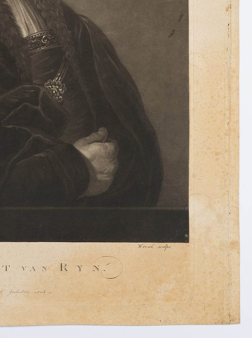 - Bezeichnung: Unterhalb der Darstellung in der Druckplatte signiert, bezeichnet und datiert:: “F. Bol pinx. Wrenk sculps./REMBRANDT VAN RYN/A Vienne au Bureau des Arts et de l’Industrie. 1804”