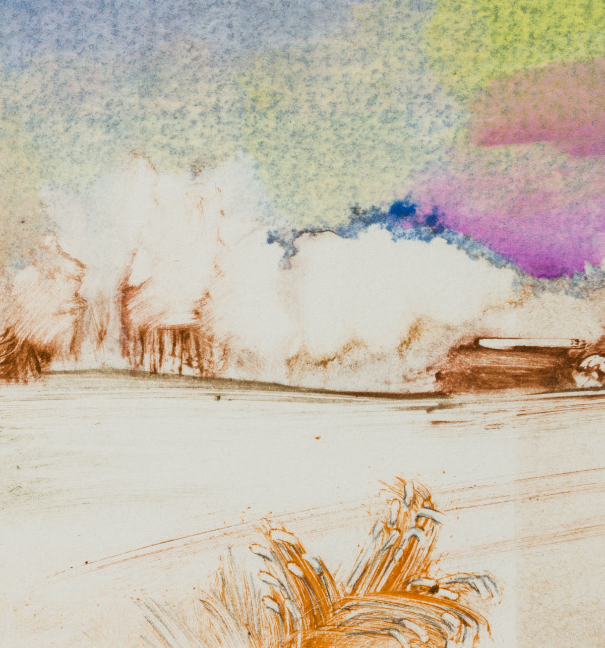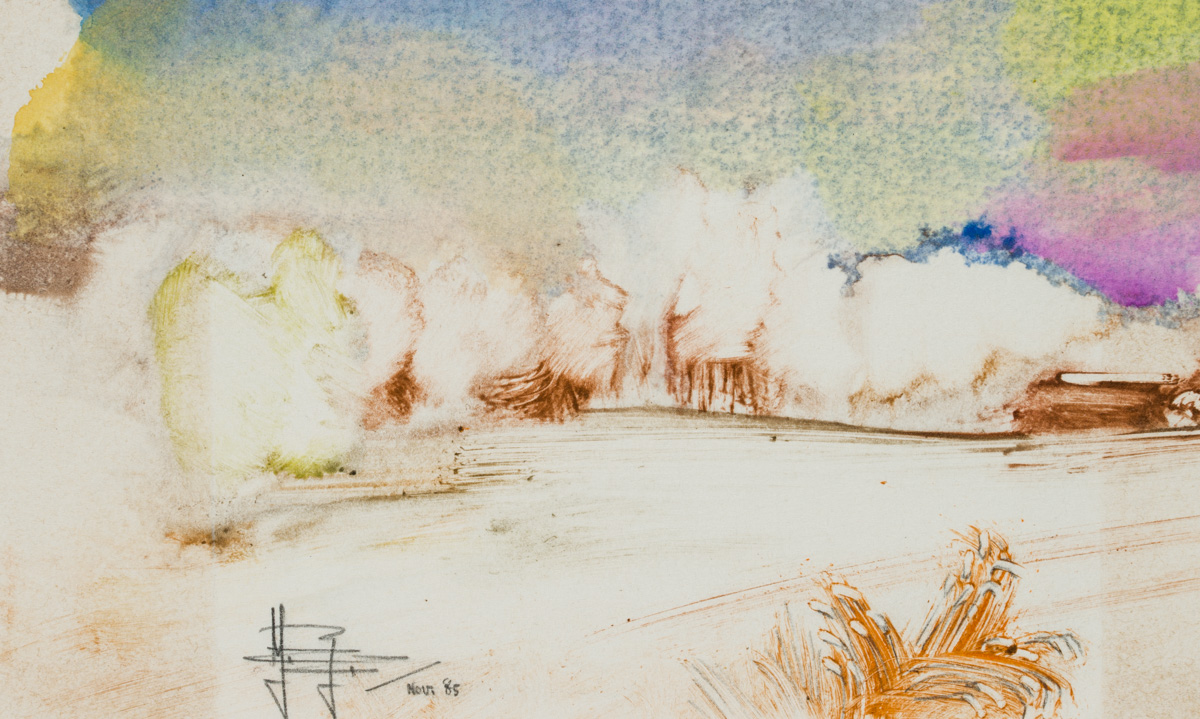• Beschreibung: monogrammiert in der Darstellung, datiert “Nov. ’85”. Landschaftsdarstellung, die am Horizont nur schematisch Objekte oder kleine Hütten andeutet. Im Vordergrund ein Strauch oder Gräser. Die Darstellung wird besonders durch die stimmungsvolle Darstellung der Wolken dominiert. Yvan ROYON (*1938) ist Maler, Zeichner, Aquarellmaler und Radierer. Er lebt und arbeitet in Brügge, Belgien. Seine Arbeiten bestechen ebenso als Miniaturen, wie im größeren Format und legen Zeugnis ab vom aufmerksamen Studium der Architektur, der Stadtlandschaft wie der Natur.
