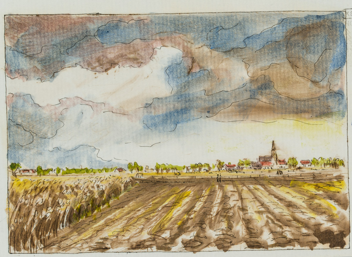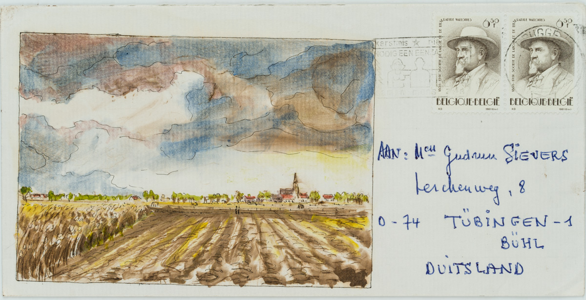 - Beschreibung: ohne Bezeichnung, mit rückseitigem Adressstempel. Blick auf ein Dorf mit Kirchturm am Horizont. Im Vordergrund bestellte Felder, der Himmel ist bewölkt. Szenerie, die einen aufmerksamen Beobachter aus der Ferne in die Darstellung integriert. Yvan ROYON (*1938) ist Maler, Zeichner, Aquarellmaler und Radierer. Er lebt und arbeitet in Brügge, Belgien. Seine Arbeiten bestechen ebenso als Miniaturen, wie im größeren Format und legen Zeugnis ab vom aufmerksamen Studium der Architektur, der Stadtlandschaft wie der Natur.