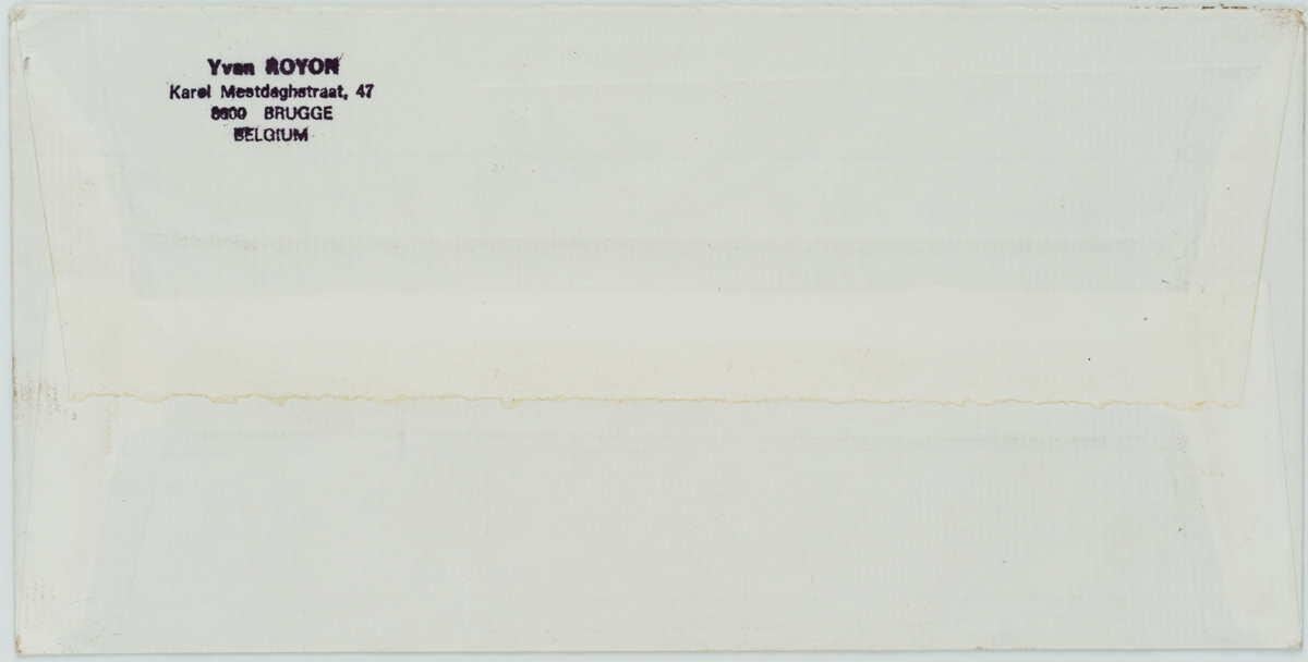 - Description: Without inscription, with address stamp on the reverse. View of a village with a church tower on the horizon. In the foreground cultivated fields, the sky is cloudy. Scenery that integrates an attentive observer from a distance into the depiction. Yvan ROYON (*1938) is a painter, draughtsman, watercolourist and etcher. He lives and works in Bruges, Belgium. His works are captivating both as miniatures and in larger format and bear witness to his attentive study of architecture, the urban landscape and nature.