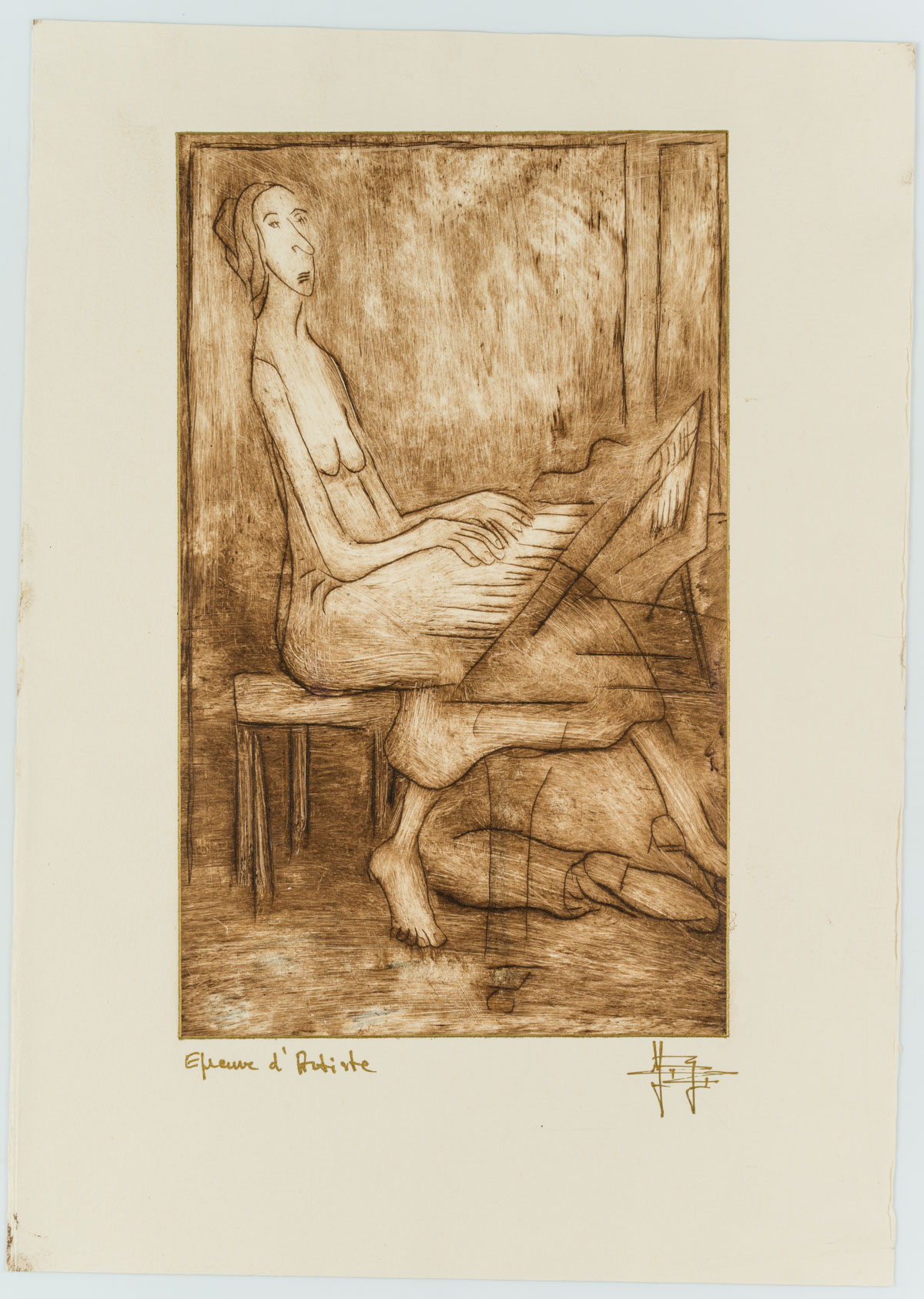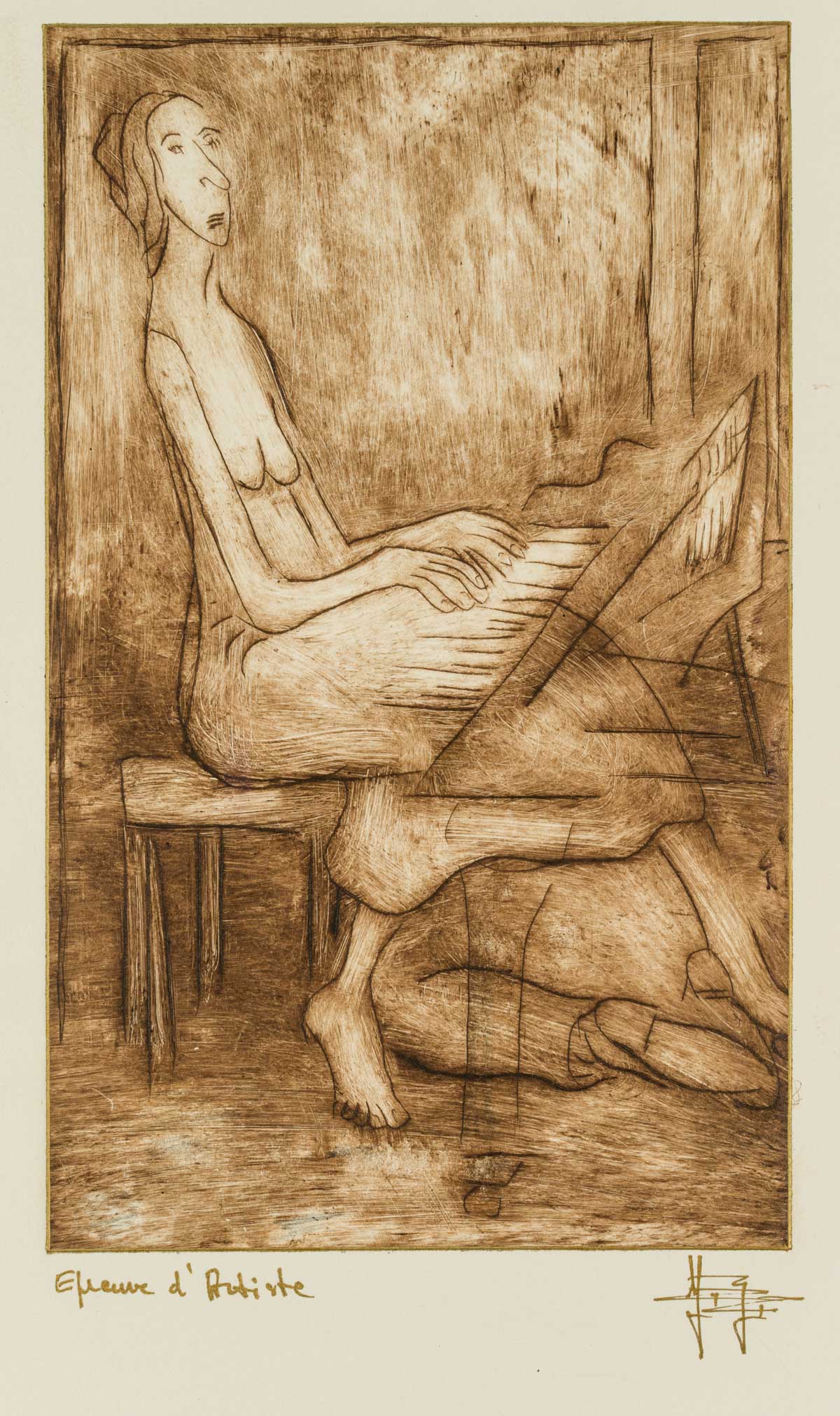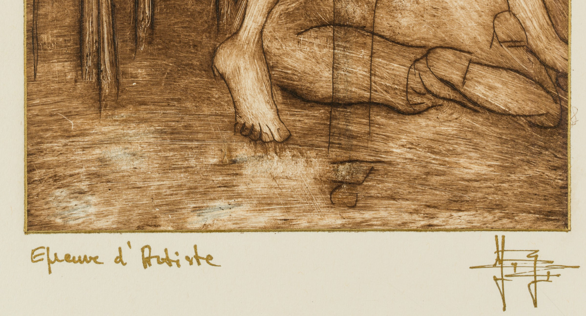 - Beschreibung: monogrammiert unterhalb der Darstellung, betitelt “(unleserlich) d’Artiste”. An einem schemenhaft skizzierten Klavier sitzt eine Frau, deren gelängter Körper sich zu den Takten ihrer Musik zu wiegen scheint. Zu ihren Füßen dann erblicken die Betrachtenden eine knieende Figur, die sich zu verstecken scheint. In der Zusammenschau zeichnet sich eine skurille Szenerie ab. Yvan ROYON (*1938) ist Maler, Zeichner, Aquarellmaler und Radierer. Er lebt und arbeitet in Brügge, Belgien. Seine Arbeiten bestechen ebenso als Miniaturen, wie im größeren Format und legen Zeugnis ab vom aufmerksamen Studium der Architektur, der Stadtlandschaft wie der Natur.
