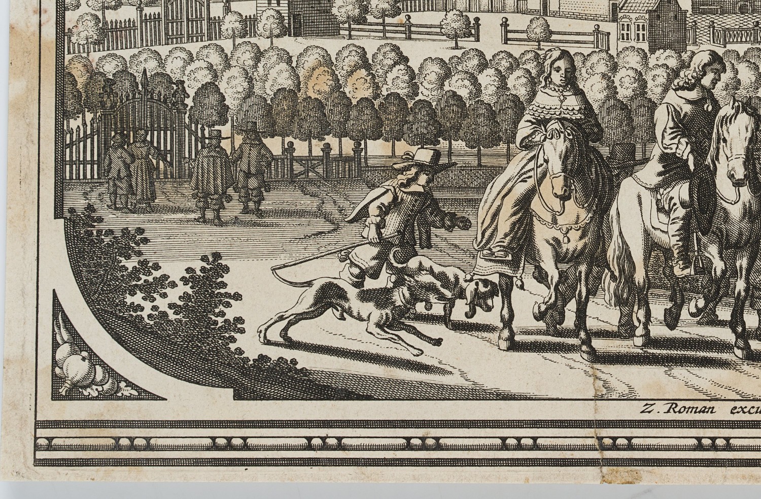 - Beschreibung: Im Vordergrund ausreitende Edelleute mit Jagdhunden. Aus einer Serie niederländischer Stadtansichten – Speculum Zelandiae um 1670.