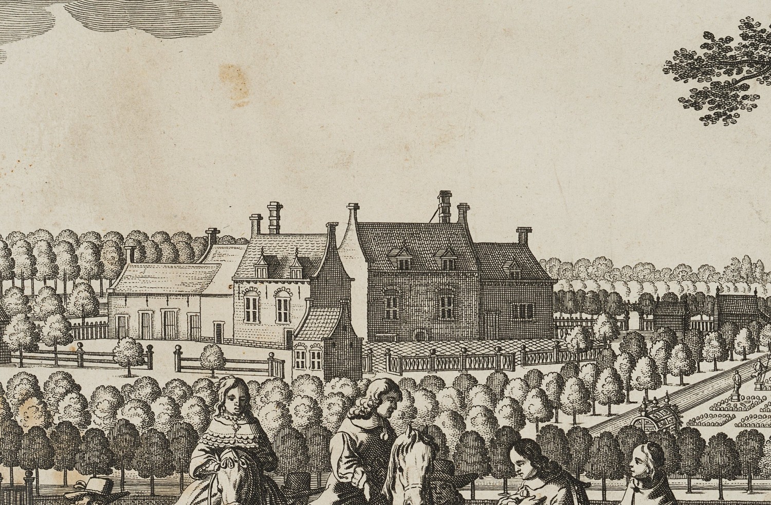 - Description: In the foreground noblemen riding out with hunting dogs. From a series of Dutch town views – Speculum Zelandiae c. 1670.