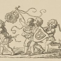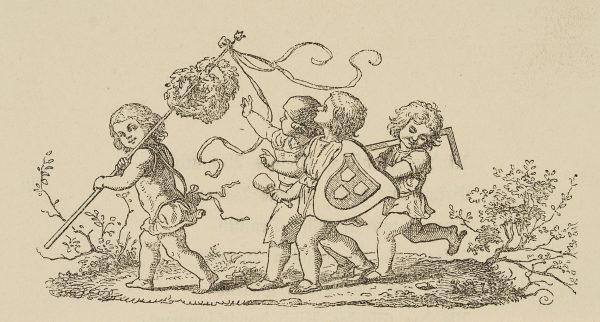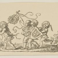 - Description: Scene with four children. Three carry attributes of the arts of sculpture, painting and architecture and follow a fourth with laurel wreaths on a pole.