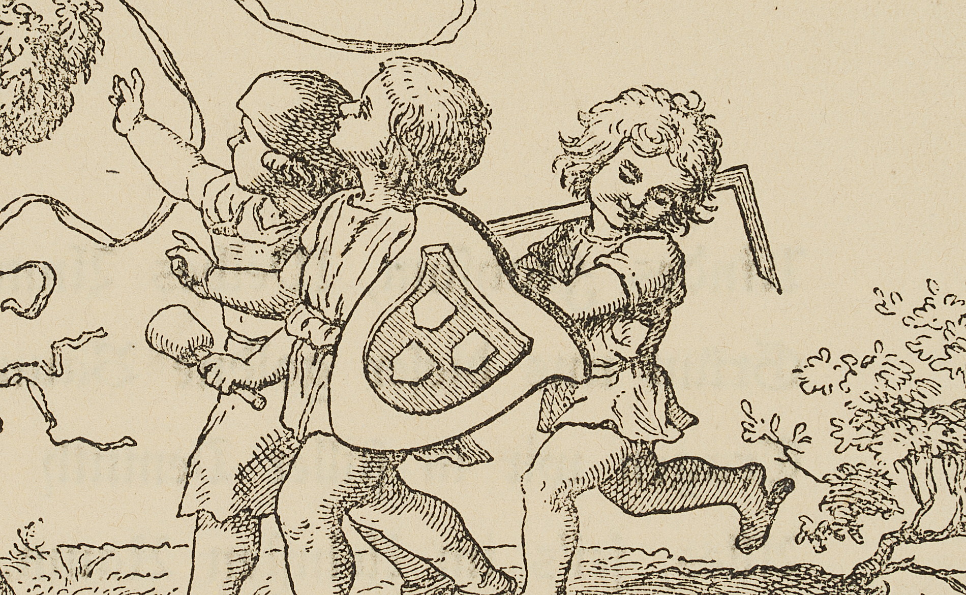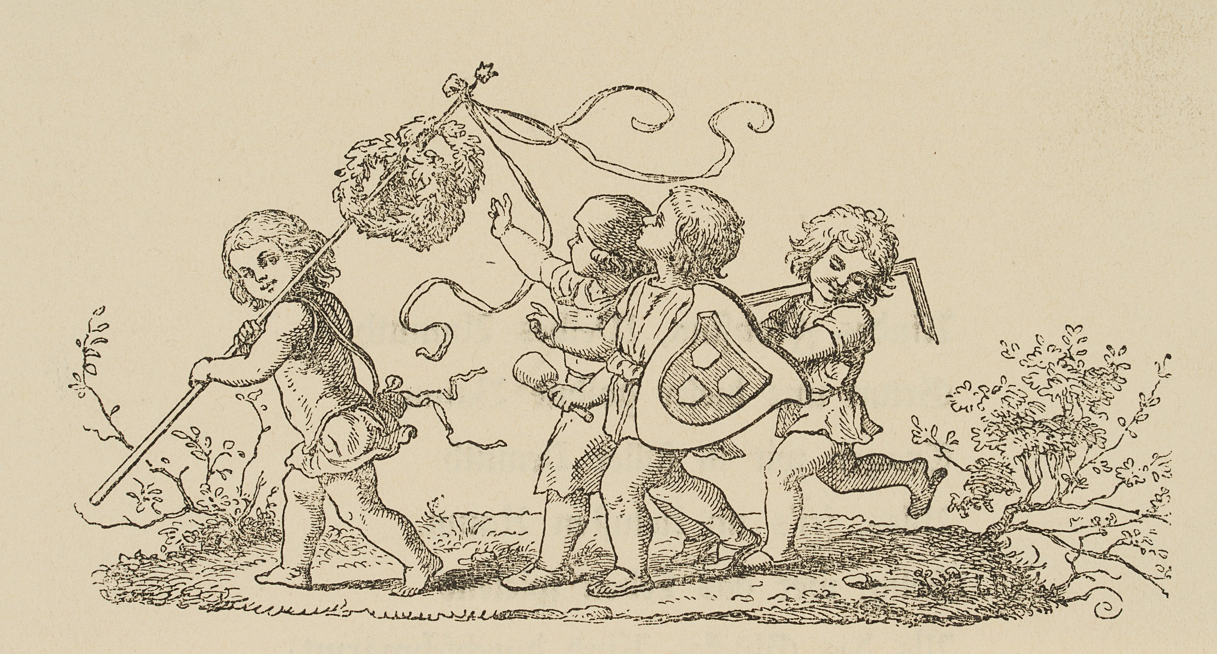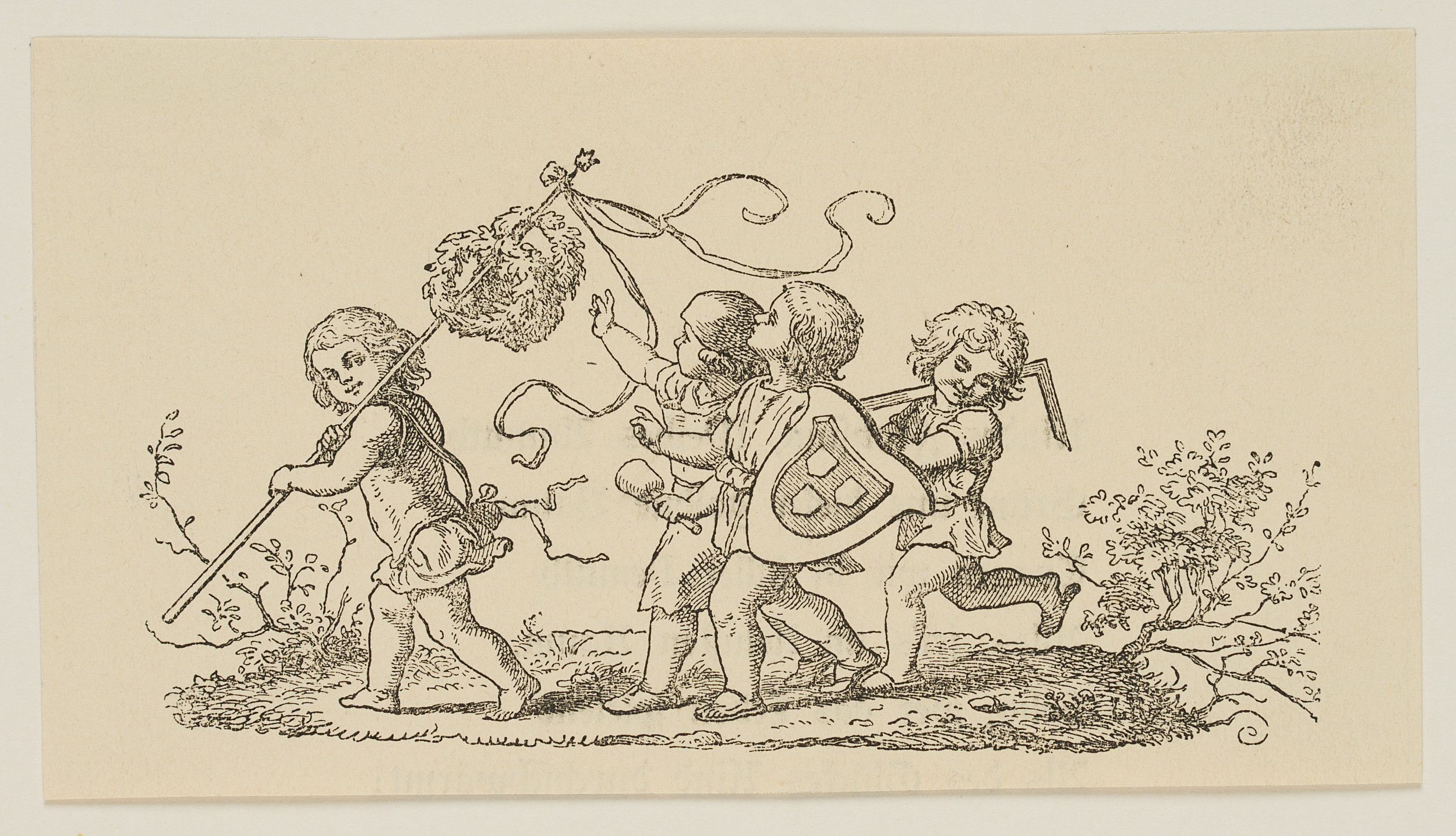 - Beschreibung: Szene mit vier Kindern. Drei tragen Attribute der Künste Bildhauerei, Malerei und Architektur und folgen einem vierten mit Lorbeerkränzen an einer Stange.