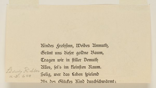 - Verso: Typographischer Druck: „Kindes Frohsinn, Weibes Anmuth […]“
