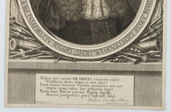 - Description: In the written oval with the name of the sitter, on a pedestal with weapons. On it an inscription plate with details of the sitter. Signed below on the left and right. Stamped in blue on the reverse
