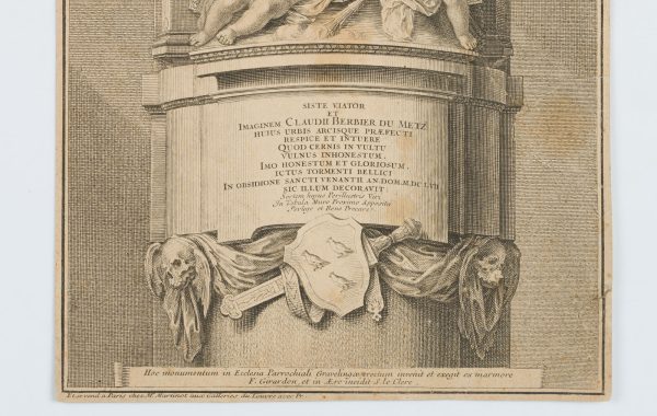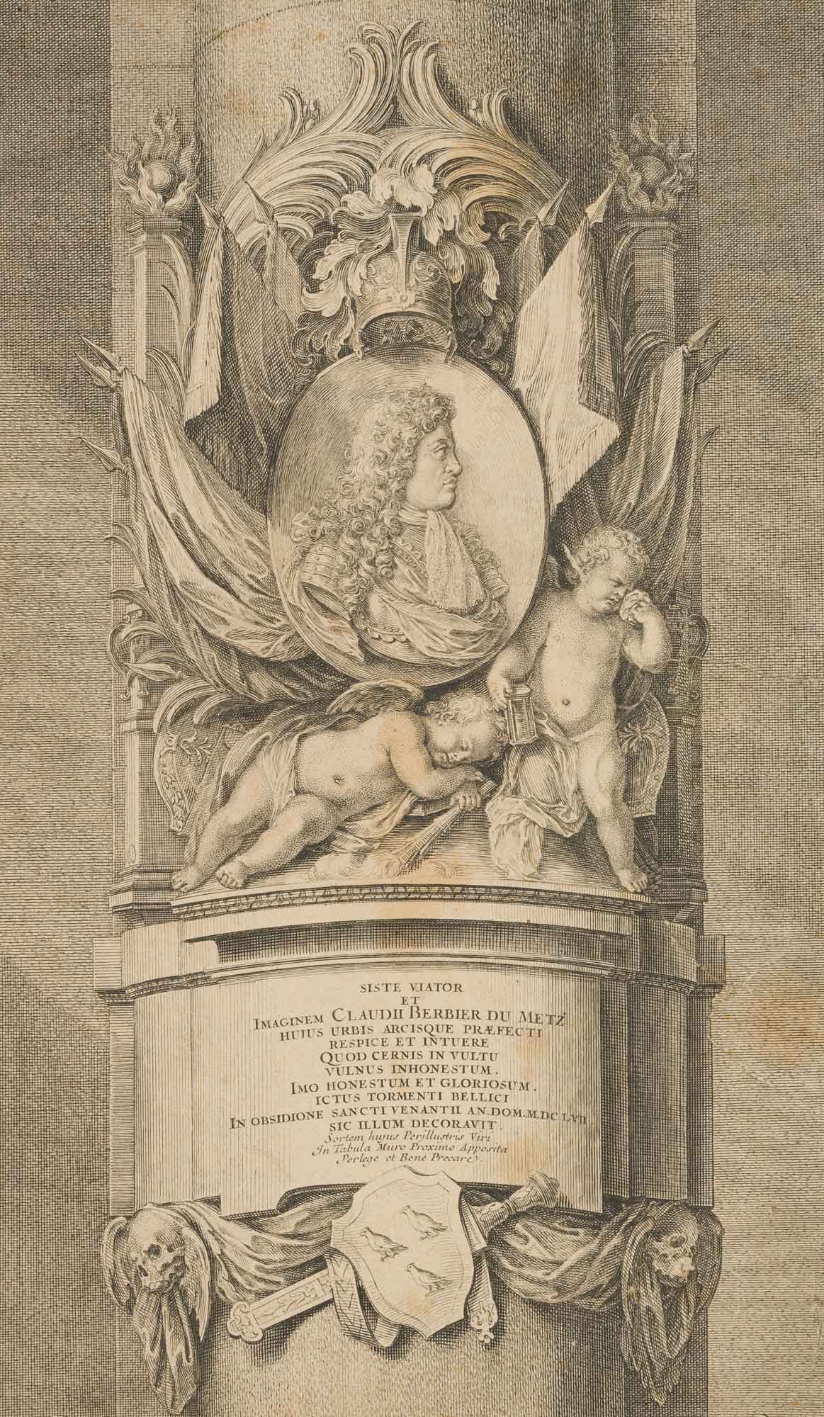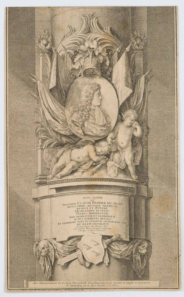 - Description: Monument to Claude Berbier du Metz in the church of Gravelines. Oval portrait of the deceased, surrounded by flags, with two mourning putti in the lower part. On the base with coat of arms and skulls. On the base with Latin commemorative text and homage. Below with signature of the sculptor and the editor.
