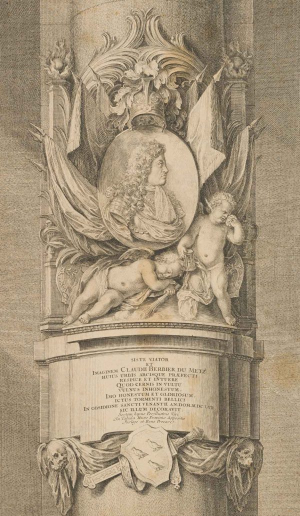 - Beschreibung: Denkmal für Claude Berbier du Metz in der Kirche von Gravelines. Ovales Porträt des Verstorbenen, von Fahnen umgeben, mit zwei Trauerputten im unteren Teil. Am Sockel mit Wappen und Totenköpfen. Auf dem Sockel mit lateinischem Gedenktext und Huldigung. Darunter mit Signatur des Bildhauers und des Herausgebers.