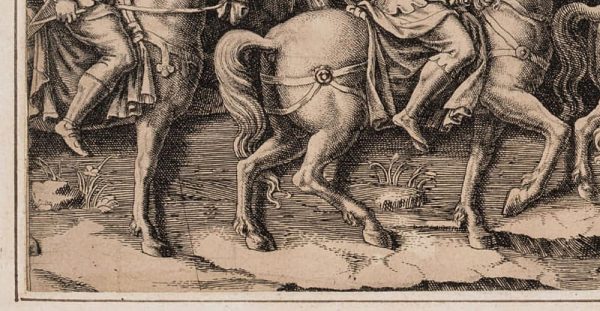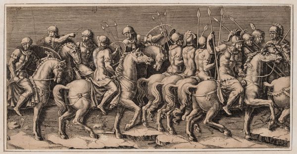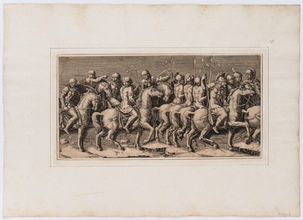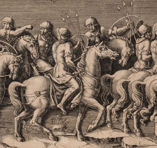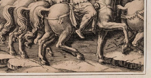 - Description: The etching is from the work L’ENTRE DE L’EMPEREUR SIGISMOND A MANTOU […]”, Paris 1675. The series shows the fresco cycle of the Camera degli Stucchi by Giulio Romano in the Palazzo del T in Mantua. It shows soldiers and generals as well as camp scenes of the ancient Roman Empire.