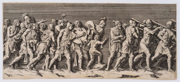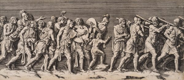 - Description: The etching is from the work L’ENTRE DE L’EMPEREUR SIGISMOND A MANTOU […]”, Paris 1675. The series shows the fresco cycle of the Camera degli Stucchi by Giulio Romano in the Palazzo del T in Mantua. It shows soldiers and generals as well as camp scenes of the ancient Roman Empire.