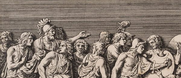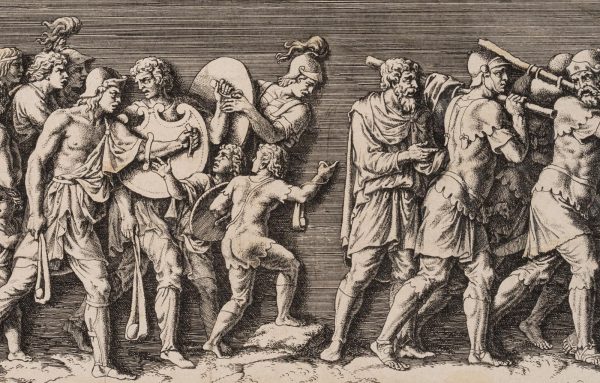 - Beschreibung: Die Radierung stammt aus dem Werk L’ENTRÉE DE L’EMPEREUR SIGISMOND A MANTOUË [..]”, Paris 1675. Die Serie zeigt den Freskenzyklus der Camera degli Stucchi des Giulio Romano im Palazzo del Tè in Mantua. Sie zeigt Soldaten und Feldherren sowie Lagerszenen des antiken römischen Reiches.