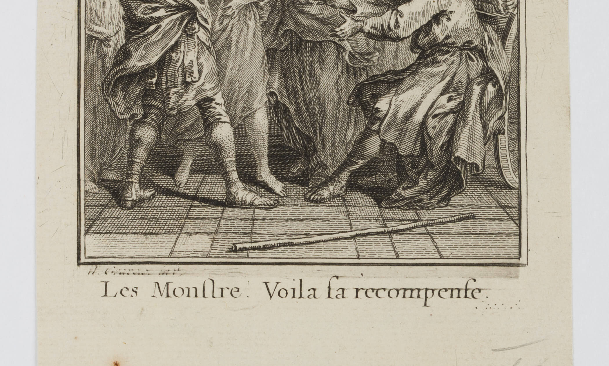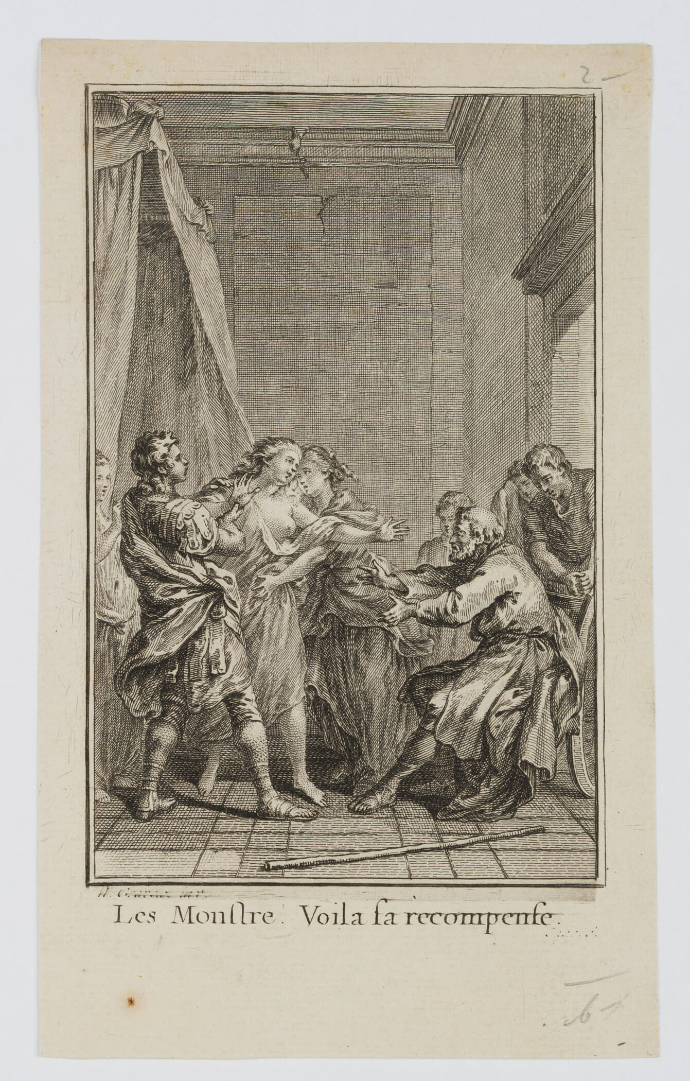 Zweiten Künstler prüfen: () nach Hubert-Francois Gravelot (*1699 ), GRAVELOT(?),’Les Monstres! voilà sa récompense’, Franz. Buchillust., 1767, Rad, 1767, Radierung