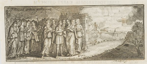 - Description: The depiction shows the personification of the Patientia, the Gratia and others in the landscape.