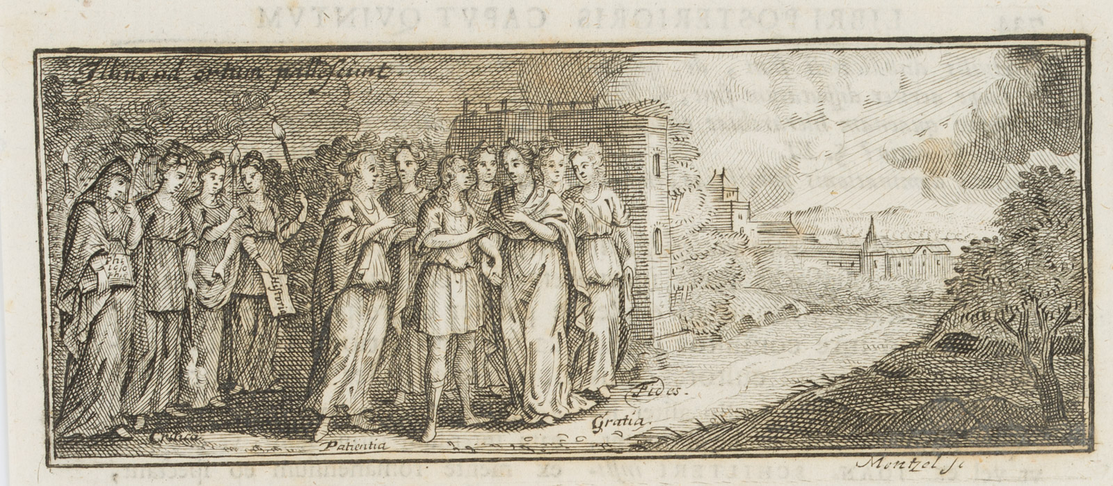 - Beschreibung: Die Darstellung zeigt die Personifikation der Patientia, der Gratia u.A.. in der Landschaft.