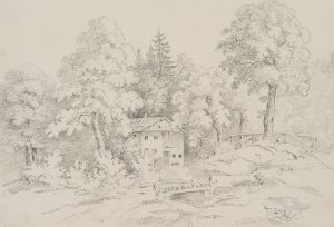 Unbekannt (19.Jhd), Haus an einem Seeufer, um 1860, Bleistift Romantik