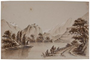 Unbekannt (19.Jhd), Landschaftsskizze. Blick über Fluss auf Haus am Gebirgshang.