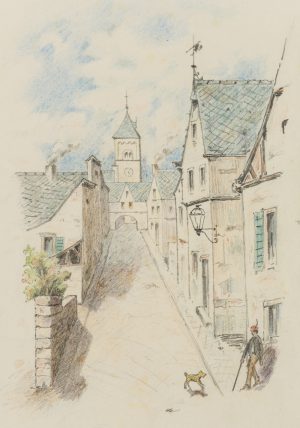 Unbekannt (20.Jhd), Landschaftsskizze und Ortsansicht mit LKW, um 1950,