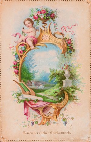 Unbekannt (19.Jhd), Glückwunschkarte mit idyllischem Garten, um 1900, um 1900,