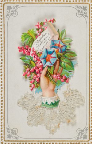 Unbekannt (19.Jhd), Glückwunschkarte. Mit Blumen, Frauenhand und Liebeskarte.,