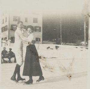 Unbekannt (19.Jhd), Postkarte mit schlittschuhlaufendem Paar, um 1900, Biederme