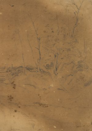 GORLAND (19.Jhd), Waldstück mit Bäumen und Zaun, Bleistift Romantik Landschaft