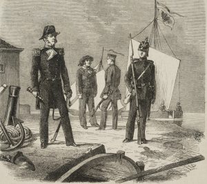 Unbekannt (19.Jhd), Preußische Marinesoldaten mit Kapitän im Hafen, Romantik