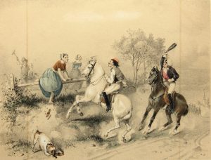 F. VIDAL (*1698), Zwei Kavaliere zu Pferd treffen eine Dame, Klassizismus Mode